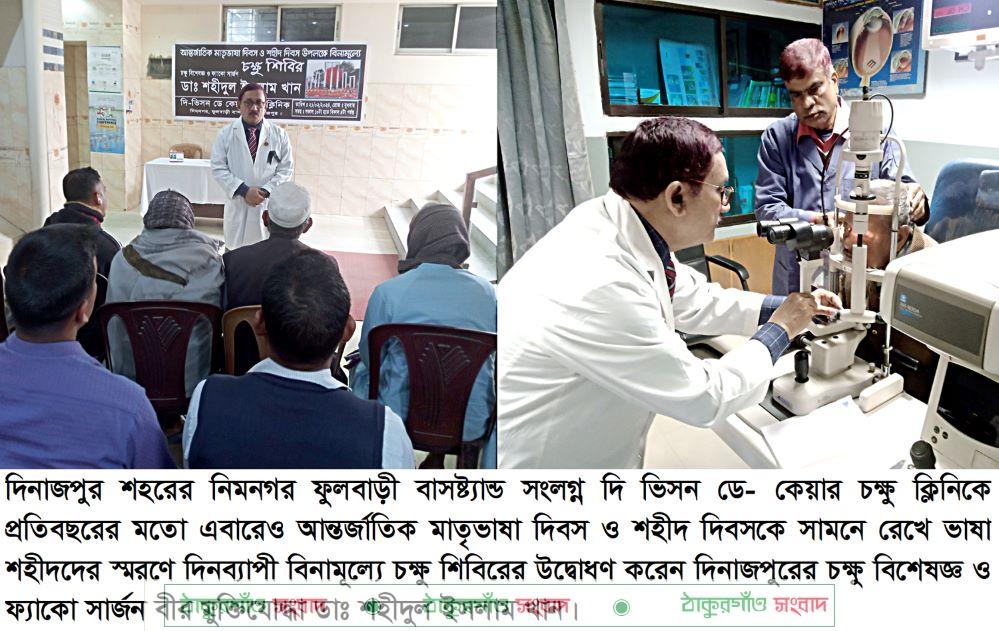 দিনাজপুর শহরের নিমনগর ফুলবাড়ী বাসষ্ট্যান্ড সংলগ্ন দি ভিসন ডে- কেয়ার চক্ষু ক্লিনিকে প্রতিবছরের মতো এবারেও আন্তর্জাতিক মাতৃভাষা দিবস ও শহীদ দিবসকে সামনে রেখে ভাষা শহীদদের স্মরণে দিনব্যাপী বিনামূল্যে চক্ষু শিবিরের উদ্বোধণ করেন দিনাজপুরের চক্ষু বিশেষজ্ঞ ও ফ্যাকো সার্জন বীর মুক্তিযোদ্ধা ডাঃ শহীদুল ইসলাম খান।