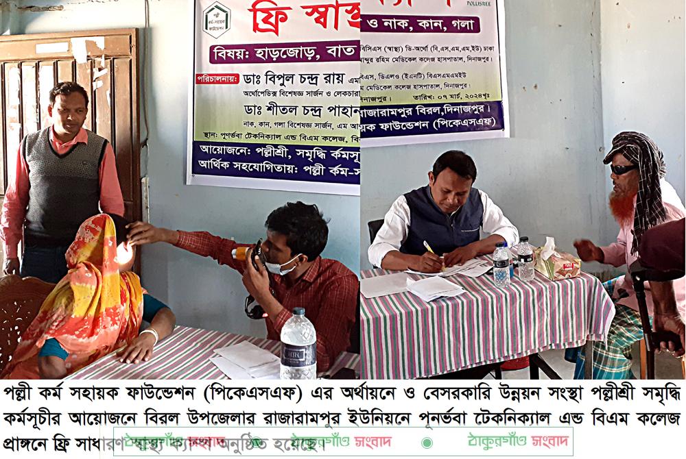 পল্লী কর্ম সহায়ক ফাউন্ডেশন (পিকেএসএফ) এর অর্থায়নে ও বেসরকারি উন্নয়ন সংস্থা পল্লীশ্রী সমৃদ্ধি কর্মসূচীর আয়োজনে বিরল উপজেলার রাজারামপুর ইউনিয়নে পূনর্ভবা টেকনিক্যাল এন্ড বিএম কলেজ প্রাঙ্গনে ফ্রি সাধারণ স্বাস্থ্য ক্যাম্প অনুষ্ঠিত হয়েছে।