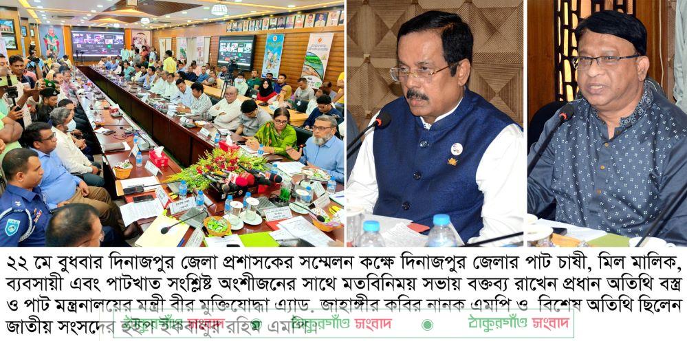 বুধবার বিকেলে পাট ও বস্ত্র মন্ত্রী জাহাঙ্গীর কবির নানক জেলা প্রশাসক সম্মেলন কক্ষ্যে দিনাজপুর জেলার পাটচাষী,মিলমালিক ও ব্যবসায়ীদের মতবিনিময় সভায় প্রধান অতিথির বক্তৃতায় এ কথা বলেন।