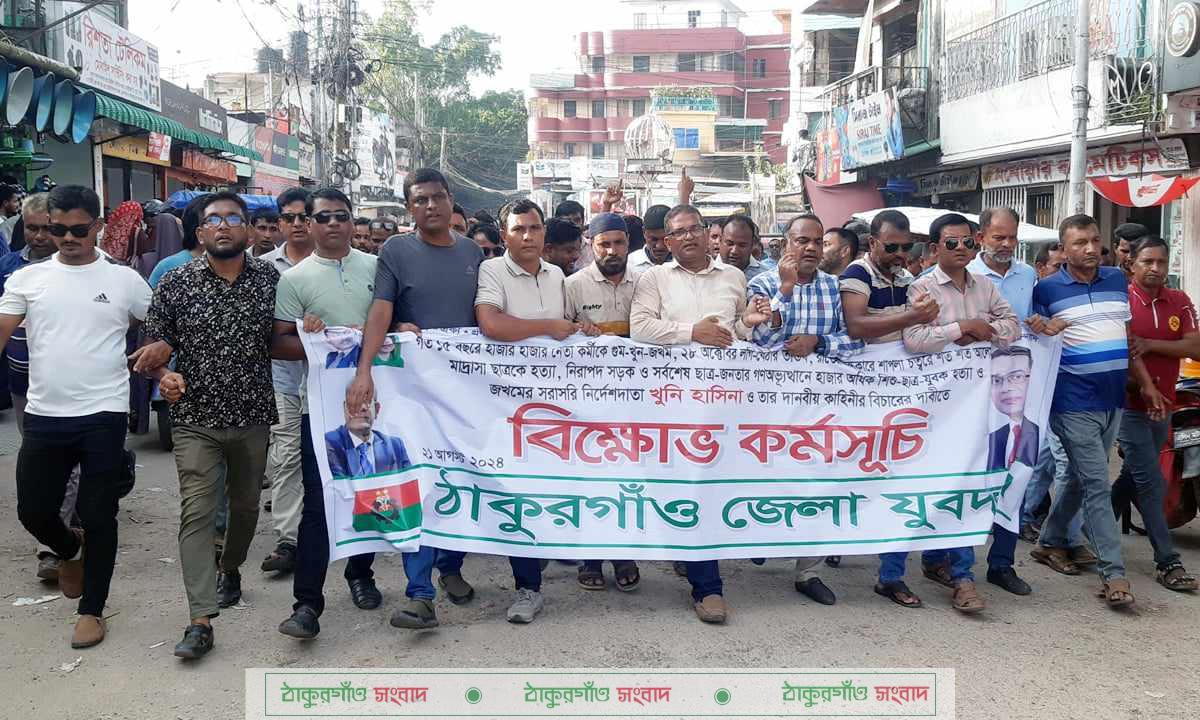 ১৫ বছরে হাজার হাজার নেতা কর্মীকে গুম-খুন-জখম, লগিবৈঠার তান্ডব, শাপলা চত্বরে হেফাতের সমাবেশে শত শত আলেম-ওলামা মাদ্রাসা ছাত্রকে হত্যা, নিরপদ সড়ক ও সর্বশেষ ছাত্র-জনতার গণঅভ্যুত্থানে হাজার অধিক শিশু-ছাত্র-যুবক হত্যা ও জখমের সরাসরি নির্দেশদাতা খুনি হাসিনা ও তার দানবীয় কাহিনীর বিচারের দাবিতে ঠাকুরগাঁওয়ে বিক্ষোভ কর্মসূচী পালিত হয়। ২১ আগষ্ট বুধবার বিকেলে বিএনপি দলীয় কার্যালয় থেকে একটি বিক্ষোভ মিছিল বের হয়ে শহরের প্রধান সড়ক প্রদক্ষিণ করে একই স্থানে গিয়ে শেষ হয়। ঠাকুরগাঁও জেলা যুবদলের আয়োজনে বিক্ষোভ মিছিল শেষে সমাবেশে ঠাকুরগাঁও জেলা যুবদলের সভাপতি চৌধুরী মাহেবুল্লাহ আবু নুরের সভাপতিত্বে বক্তব্য দেন, ঠাকুরগাঁও জেলা বিএনপির সহ -সভাপতি বীর মুক্তিযোদ্ধা নূর করিম, যুগ্ম সম্পাদক সাবেক ইউপি চেয়ারম্যান মো: পয়গাম আলী, থানা বিএনপির সাধারণ সম্পাদক ও জেলা যুবদলের সাধারণ সম্পাদক মাহাবুব হোসেন তুহিন, থানা যুবদলের সভাপতি রেজাউল করিম লিটন, সাধারণ সম্পাদক মাসুদ রানা ডানো, পৌর যুবদলের সভাপতি মো: মনিরুজ্জামান লিটন, সাধারণ সম্পাদক মো: বেলায়েত হোসেন, রুহিয়া ইউনিয়ন যুবদলের সভাপতি আনার আলী, সাধারণ সম্পাদক নূরে আলম রুবেল প্রমুখ। বিক্ষোভ কর্মসূচীতে জেলা বিএনপি, জেলা যুবদলের বিভিন্ন স্তরের নেতা-কর্মী ও সমর্থকগণ অংশ নেন। বক্তারা ১৫ বছরে হাজার হাজার নেতা কর্মীকে গুম-খুন-জখম, লগিবৈঠার তান্ডব, শাপলা চত্বরে হেফাতের সমাবেশে শত শত আলেম-ওলামা মাদ্রাসা ছাত্রকে হত্যা, নিরপদ সড়ক ও সর্বশেষ ছাত্র-জনতার গণঅভ্যুত্থানে হাজার অধিক শিশু-ছাত্র-যুবক হত্যা ও জখমের সরাসরি নির্দেশদাতা খুনি হাসিনা ও তার দানবীয় কাহিনীর বিচারের দাবি জানান।