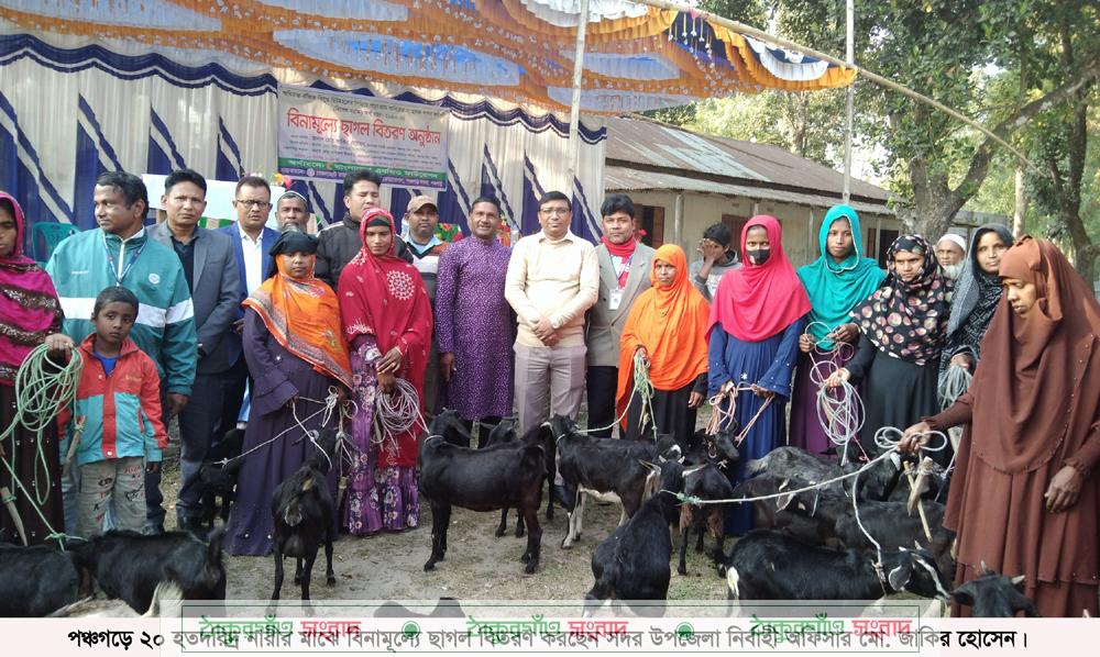 পঞ্চগড় প্রতিনিধি\ পঞ্চগড়ে হত দরিদ্র মহিলাদের ছাগল পালনের মাধ্যমে আত্মসামাজিক উন্নয়ন প্রকল্পের আওতায় ২০ জন নারীর মাঝে দুইটি করি ছাগল বিনামূল্যে হস্তান্তর করা হয়েছে। বাংলাদেশ এনজিও ফাউন্ডেশন-বিএনএফ’র ২০২৩-২৪ অর্থ বছরের বিশেষ বরাদ্দের প্রথম পর্যায়ের অনুদানের অর্থে ওই প্রকল্পটি বাস্তবায়ন করে সদর উপজেলার চাকলাহাট ইউনিয়ন সমাজ কল্যাণ ফেডারেশন। এ উপলক্ষে গতকাল সোমবার বিকেলে সদর উপজেলার হাড়িভাসা ইউনিয়নের পাহাড়তলী উচ্চ বিদ্যালয় মাঠে উপকারভোগীদের সমাবেশ ও ছাগল বিতরণ অনুষ্ঠানের আয়োজন করা হয়। অনুষ্ঠানে প্রধান অতিথি হিসেবে উপস্থিত ছিলেন সদর উপজেলা নির্বাহী অফিসার মো. জাকির হোসেন। চাকলাহাট ইউনিয়ন সমাজকল্যাণ ফেডারেশনের চেয়ারম্যান সহিরুল ইসলামের সভাপতিত্বে অনুষ্ঠানে অন্যান্যদের মাঝে বক্তব্য দেন আরডিআরএস বাংলাদেশ পঞ্চগড় এর জেলা প্রোগ্রাম অফিসার জহুরুল ইসলাম, টেকনিক্যাল অফিসার কৃষিবিদ রবিউল আলম, কমিউনিটি ডেভেলপমেন্ট সুপারভাইজার আতিকুর রহমান, রংপুর বিভাগীয় ফেডারেশনের সভাপতি সোলায়মান আলী, পাহাড়তলী উচ্চ বিদ্যালয়ের প্রধান শিক্ষক রমজান আলী, মির্জাপুর ইউনিয়ন ফেডারেশনের চেয়ারম্যান দবিরুল ইসলাম, হাড়িভাসা ইউনিয়ন ১ নং ওয়ার্ডের বিএনপির সভাপতি আমিনুর রহমান ডাবলু প্রমূখ। উল্লেখ্য, গত এক বছর আগে এ সকল হত দরিদ্র মহিলাদের মাঝে দুইটি করে ছাগল দেয়া হয়। এক বছর লালন পালন শেষে গতকাল তাদের হাতে ছাগলগুলো হস্তান্তর করা হয়। এরই মধ্যে ছাগলগুলোর দুইটি থেকে চারটি পর্যন্ত বাচ্চা হয়েছে।