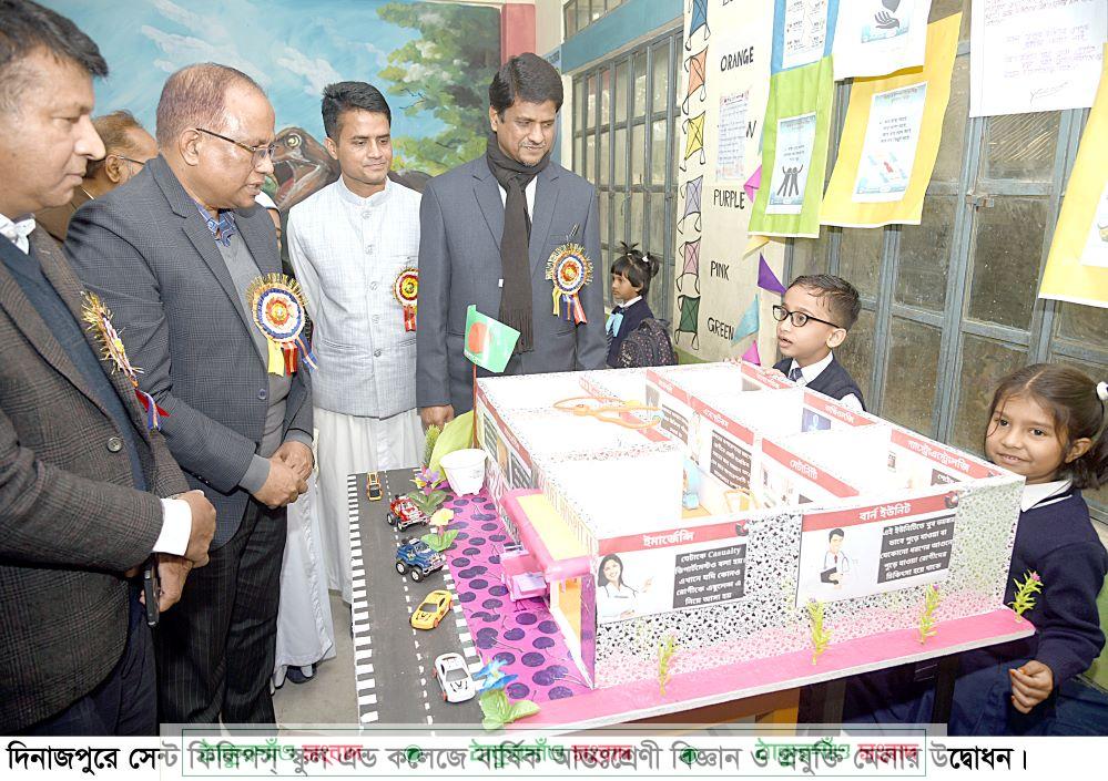 ফিতা কেটে আনুষ্ঠানিকভাবে দিনাজপুর সেন্ট ফিলিপস্ হাই স্কুল এন্ড কলেজ-এর আয়োজনে দু’দিন ব্যাপী বার্ষিক আন্তঃশ্রেণী বিজ্ঞান ও প্রযুক্তি মেলা-২০২৫ এর উদ্বোধনের পর খুদে বিজ্ঞানীদের আবিষ্কৃত বিভিন্ন প্রজেক্ট পরিদর্শন করেন অতিথিবৃন্দ। নিজেদের আবিষ্কৃত বিভিন্ন প্রজেক্ট প্রদর্শন করতে পেরে খুশি সেন্ট ফিলিপস্ হাই স্কুল এন্ড কলেজ-এর খুদে বিজ্ঞানীরা।