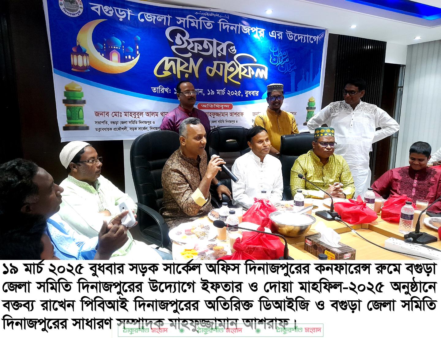 বুধবার সড়ক সার্কেল অফিস দিনাজপুরের কনফারেন্স রুমে বগুড়া জেলা সমিতি দিনাজপুরের উদ্যোগে ইফতার ও দোয়া মাহফিল অনুষ্ঠিত হয়েছে। অনুষ্ঠিত ইফতার ও দোয়া মাহফিলে দিনাজপুর সড়ক সার্কেলের তত্ত¡াবধায়ক প্রকৌশলী ও বগুড়া জেলা সমিতির দিনাজপুরের সভাপতি মোঃ মাহবুবুল আলম খান-এর সভাপতিত্বে আমন্ত্রিত অতিথি হিসেবে উপস্থিত ছিলেন পিবিআই দিনাজপুরের অতিরিক্ত ডিআইজি ও বগুড়া জেলা সমিতি দিনাজপুরের সাধারণ সম্পাদক মাহফুজ্জামান আশরাফ, অতিরিক্ত জেলা প্রশাসক (শিক্ষা ও আইসিটি) এবং বগুড়া জেলা সমিতি দিনাজপুরের উপদেষ্টা এস এম হাবিবুল হাসান।