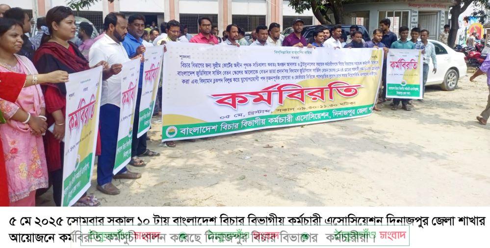 বাংলাদেশ বিচার বিভাগীয় কর্মচারী এসোসিয়েশন দিনাজপুর জেলা শাখার আয়োজনে কর্মবিরতি কর্মসুচী পালন করেছে দিনাজপুর বিচার বিভাগের কর্মচারীরা।