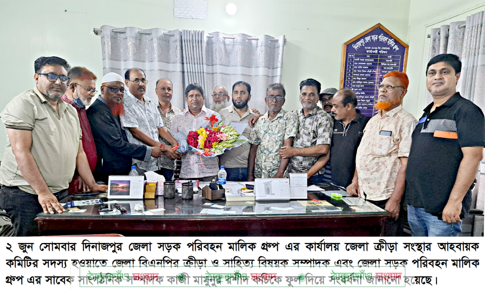 সোমবার দিনাজপুর জেলা সড়ক পরিবহন মালিক গ্রæপ এর কার্যালয় জেলা ক্রীড়া সংস্থার আহবায়ক কমিটির সদস্য হওয়াতে জেলা বিএনপির ক্রীড়া ও সাহিত্য বিষয়ক সম্পাদক এবং জেলা সড়ক পরিবহন মালিক গ্রæপ এর সাবেক সাংগঠনিক সম্পাদক কাজী মামুনুর রশীদ কচিকে ফুল দিয়ে সংবর্ধনা জানানো হয়েছে।