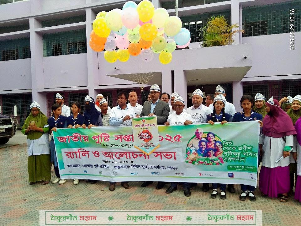 পঞ্চগড় প্রতিনিধি\পঞ্চগড়ে বিভিন্ন কর্মসূচির মধ্য দিয়ে জাতীয় পুষ্টি সপ্তাহ শুরু হয়েছে। গতকাল বৃহস্পতিবার সকালে সিভিল সার্জন কার্যালয়ের সামনে বেলুন উড়িয়ে পুষ্টি সপ্তাহের উদ্বোধন করেন পঞ্চগড়ের জেলা প্রশাসক ও জেলা পুষ্টি সমন্বয় কমিটির সভাপতি মো. সাবেত আলী। পরে সেখান থেকে একটি শোভাযাত্রা বের করা হয়। শোভাযাত্রা শেষে সিভিল সার্জন অফিসের