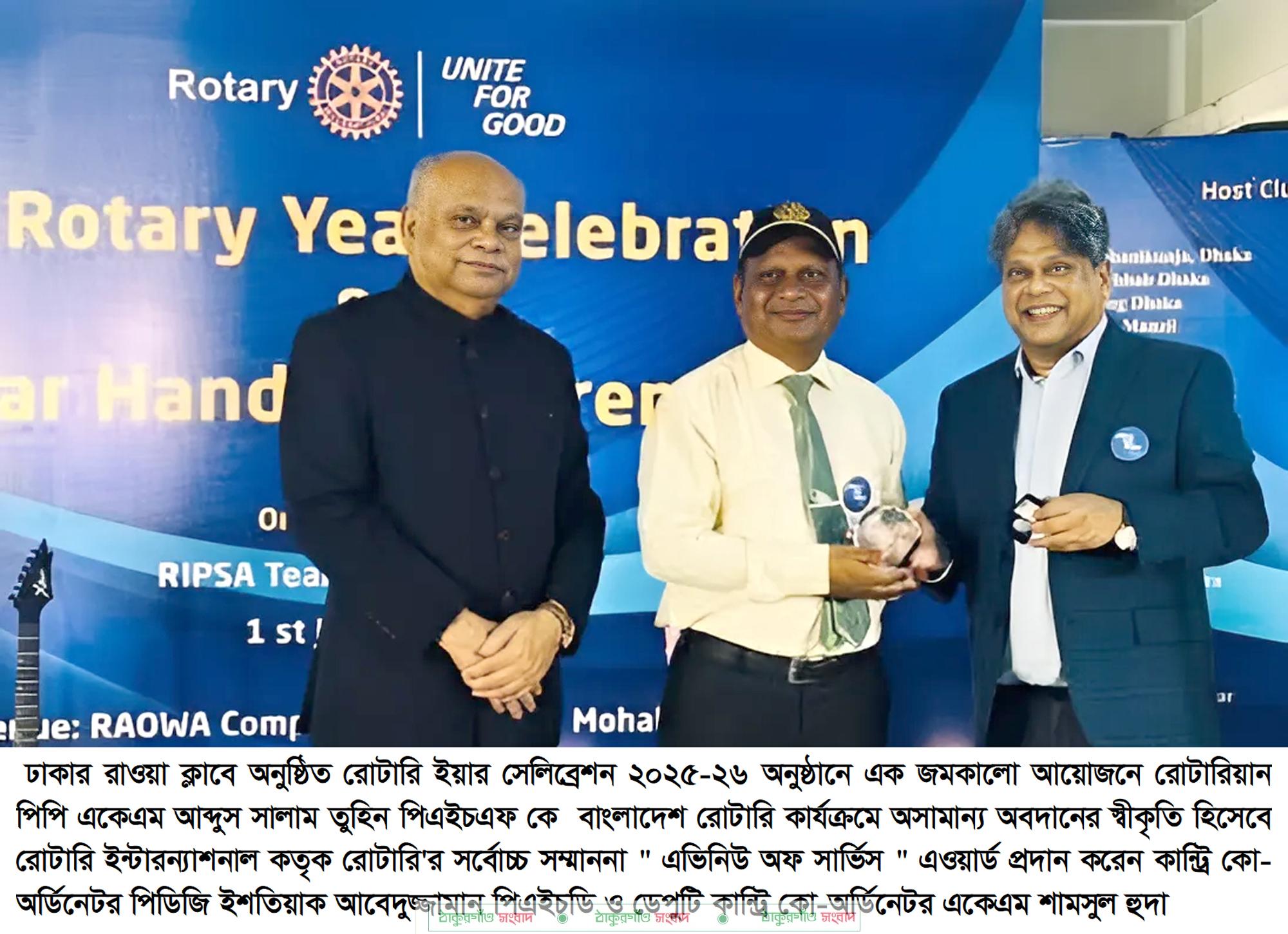 ঢাকার রাওয়া ক্লাবে অনুষ্ঠিত রোটারি ইয়ার সেলিব্রেশন ২০২৫-২৬ অনুষ্ঠানে এক জমকালো আয়োজনে রোটারিয়ান পিপি একেএম আব্দুস সালাম তুহিন পিএইচএফ কে বাংলাদেশ রোটারি কার্যক্রমে অসামান্য অবদানের স্বীকৃতি হিসেবে রোটারি ইন্টারন্যাশনাল কতৃক রোটারি’র সর্বোচ্চ সম্মাননা ” এভিনিউ অফ সার্ভিস ” এওয়ার্ড প্রদান করা হয়।