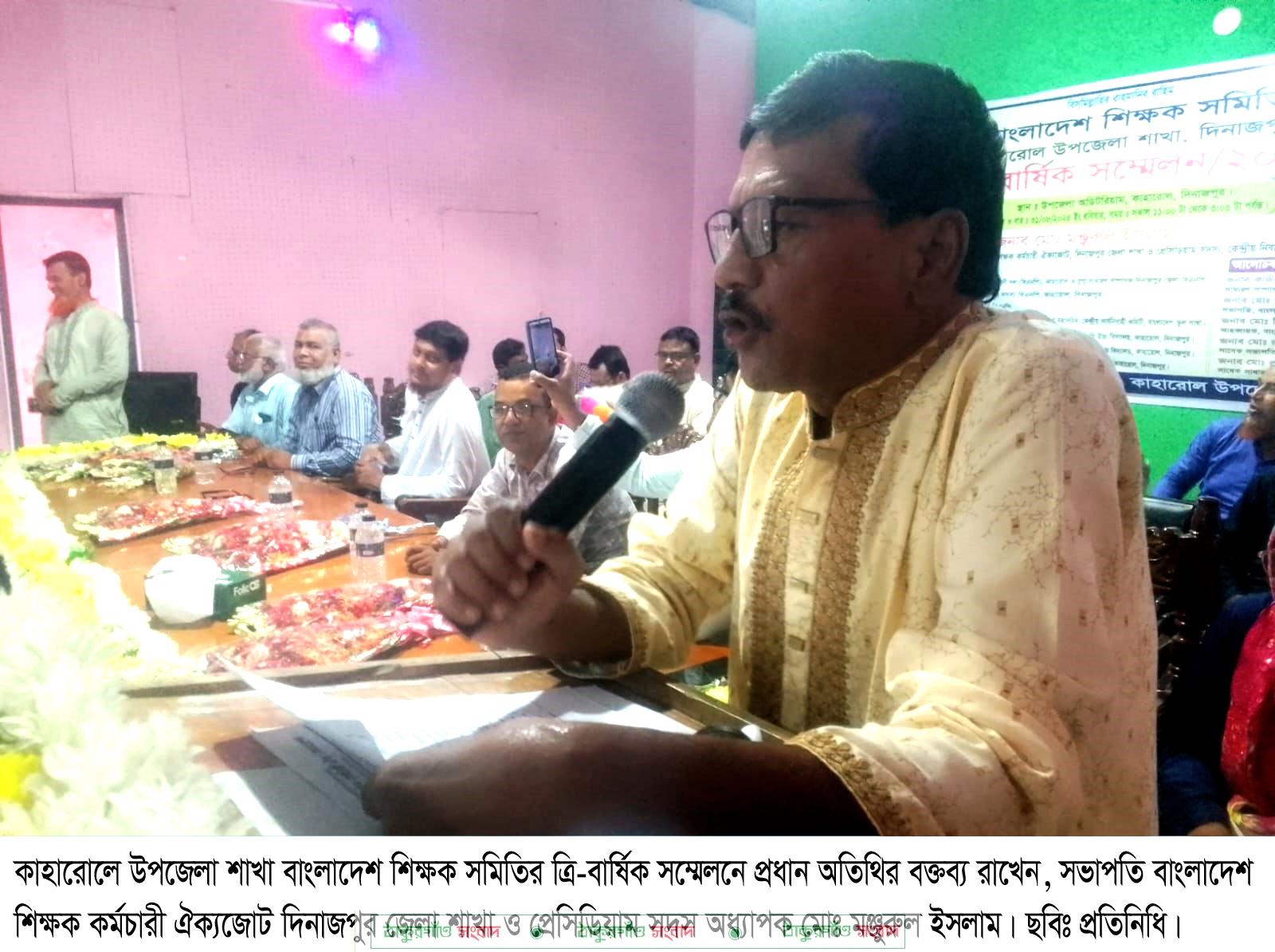 রোববার সকাল ১১টা থেকে বিকাল ৩টা পর্যন্ত উপজেলা পরিষদ অডিটোরিয়ামে কাহারোল উপজেলা শাখা বাংলাদেশ শিক্ষক সমিতির ত্রি-বার্ষিক সম্মেলন ও আলোচনা সভা জয়নন্দ এস,সি উচ্চ বিদ্যালয়ের প্রধান শিক্ষক তাপস রায়ের সভাপতিত্বে ও প্রধান শিক্ষক মোকারম হোসেন সঞ্চালনায় অনুষ্ঠিত হয়। সম্মেলন ও আলোচনা সভায় প্রধান অতিথি হিসেবে বক্তব্য রাখেন, সভাপতি, বাংলাদেশ শিক্ষক কর্মচারী ঐক্যজোট, দিনাজপুর জেলা শাখা ও প্রেসিডিয়াম সদস্য, কেন্দ্রীয় কার্যনির্বাহী কমিটি, বাংলাদেশ কলেজ শাখার অধ্যাপক মোঃ মঞ্জুরুল ইসলাম। বিশেষ অতিথি হিসেবে বক্তব্য রাখেন, উপজেলা বিএনপি’র সভাপতি মোঃ গোলাম মোস্তফা বাদশা, দিনাজপুর জেলা শাখা শিক্ষক সমিতির সাধারণ সম্পাদক মোঃ মাহমুদুল হাসান। সম্মেলনে আলোচক হিসেবে বক্তব্য রাখেন, বাংলাদেশ শিক্ষক কর্মচারী ঐক্যজোট, দিনাজপুর জেলা শাখার সাধারণ সম্পাদক কাজী আব্দুর রশিদ, বাংলাদেশ শিক্ষক সমিতি, দিনাজপুর জেলা শাখা সভাপতি মোঃ শহিদুল ইসলাম, বাংলাদেশ শিক্ষক সমিতি, দিনাজপুর জেলা শাখার আহব্বায়ক মোঃ মিজানুর রহমান, বাংলাদেশ শিক্ষক সমিতি কাহারোল উপজেলার সাবেক সভাপতি মোঃ রাহমাতুল্লাহ, সাবেক সাধারণ সম্পাদক মোঃ রুস্তম আলী।