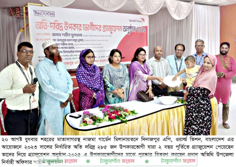 বুধবার শহরের মাতাসাগরস্থ নাজমা গার্ডেন মিলানায়তনে দিনাজপুর এপি, ওয়ার্ল্ড ভিশন, বাংলাদেশ এর আয়োজনে ২০২৩ সালের নির্ধারিত অতি দরিদ্র ২৮৫ জন উপকারভোগী যারা ২ বছর পূর্তিতে গ্র্যাজুয়েশন পেয়েছেন তাদের নিয়ে গ্র্যাজুয়েশন অনুষ্ঠান-২০২৫ অনুষ্ঠিত হয়েছে।