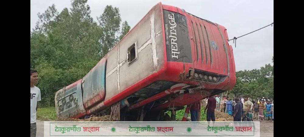 পুলিশ ও স্থানীয়রা জানায়, ঢাকা থেকে ছেড়ে আসা হেরিটেজ পরিবহনের একটি রাত্রিকালীন যাত্রীবাহী বাস দিনাজপুরের উদ্দেশ্যে আসছিল। বাসটি দ্রæতগামী ছিল। ভোরের দিকে ওই মহাসড়কে দিনাজপুরের আমবাড়ী এলাকায় নিয়ন্ত্রণ হারিয়ে বাসটি উল্টে রাস্তার পাশের জলাশয়ে খাদে পড়ে যায়। এতে বাসে থাকা যাত্রীদের মধ্যে কমবেশি ১২জন আহত হন। ঘটনার পরপরই স্থানীয়রা যাত্রীদের উদ্ধারে এগিয়ে আসে। আহতদের স্থানীয়দের সহায়তায় উদ্ধার করে দিনাজপুর মেডিকেল কলেজ হাসপাতালে ভর্তি করা হয়েছে। দিনাজপুর মেডিকেল কলেজ হাসপাতালে প্রাথমিক চিকিৎসা নিয়ে কয়েকজন যাত্রী চলে গেলেও ৬ জন আহত যাত্রী হাসপাতালে চিকিৎসা নিচ্ছেন। এসময় যাত্রীরা জানান, বাসের চালক ঘুমন্ত অবস্থায় স্টিয়ারিং নিয়ন্ত্রণ হারালে এ দুর্ঘটনা ঘটে। আহত একজনের নাম পাওয়া গেছে তিনি গণঅধিকার পরিষদের সহসভাপতি ফারুক হোসেন। আহত যাত্রীদের প্রয়োজনীয় চিকিৎসা দেওয়ার কথা জানালেন হাসপাতালে চিকিৎসক।