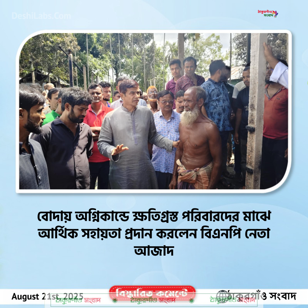 বুধবার দুপুরে বাংলাদেশ জাতীয়তাবাদী দল বিএনপির কেন্দ্রীয় নির্বাহী কমিটির পল্লী উন্নয়ন বিষয়ক সম্পাদক ও পঞ্চগড় জেলা বিএনপির সদস্য সচিব আলহাজ্ব ফরহাদ হোসেন আজাদ ক্ষতিগ্রস্ত এলাকা পরিদর্শন করে, আগুনে বাড়িঘর পুড়ে যাওয়া পরিবারদের সমবেদনা জানান এবং ব্যক্তিগতভাবে আর্থিক সহায়তা প্রদান করেন। এ সময় ময়দানদিঘী ইউনিয়ন বিএনপি নেতা সাজ্জাদার রহমান আবু সহ বিএনপি নেতৃবৃন্দ উপস্থিত ছিলেন।