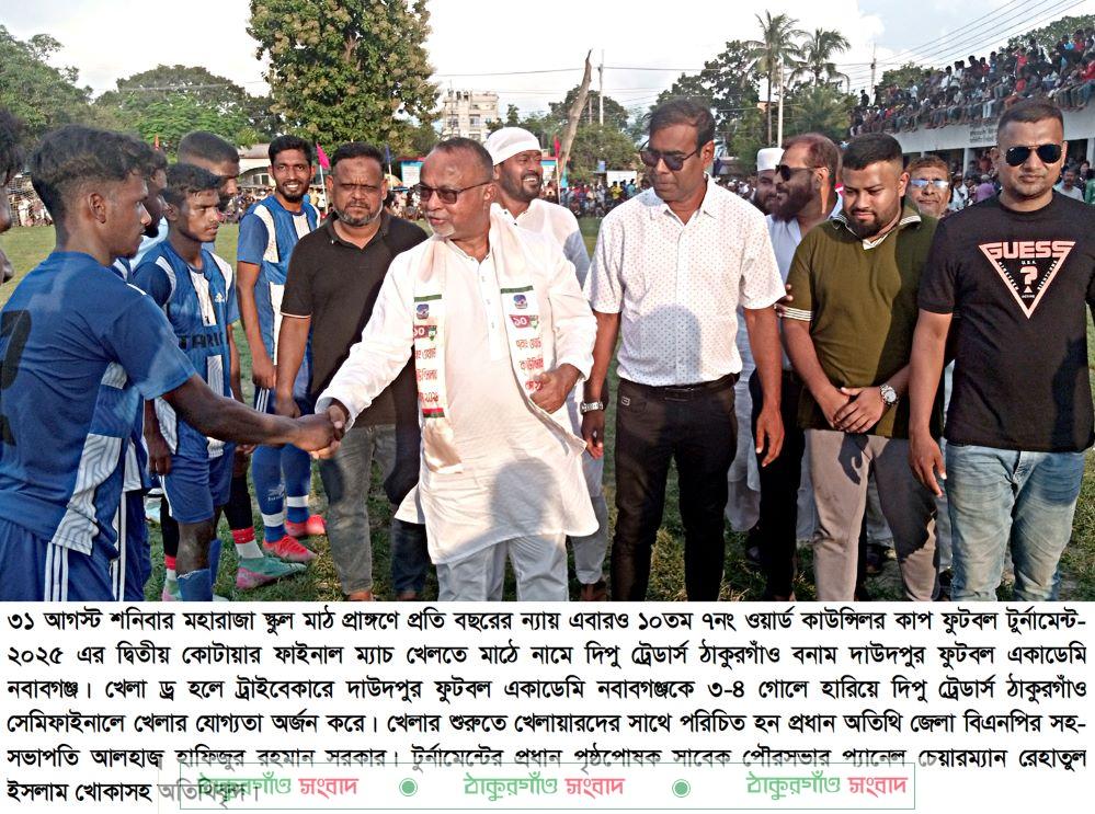 শনিবার মহারাজা স্কুল মাঠ প্রাঙ্গণে প্রতি বছরের ন্যায় এবারও ১০তম ৭নং ওয়ার্ড কাউন্সিলর কাপ ফুটবল টুর্নামেন্ট-২০২৫ এর দ্বিতীয় কোটায়ার ফাইনাল ম্যাচ খেলতে মাঠে নামে দিপু ট্রেডার্স ঠাকুরগাঁও বনাম দাউদপুর ফুটবল একাডেমি নবাবগঞ্জ। খেলা ড্র হলে ট্রাইবেকারে দাউদপুর ফুটবল একাডেমি নবাবগঞ্জকে ৩-৪ গোলে হারিয়ে দিপু ট্রেডার্স ঠাকুরগাঁও সেমিফাইনালে খেলার যোগ্যতা অর্জন করে।