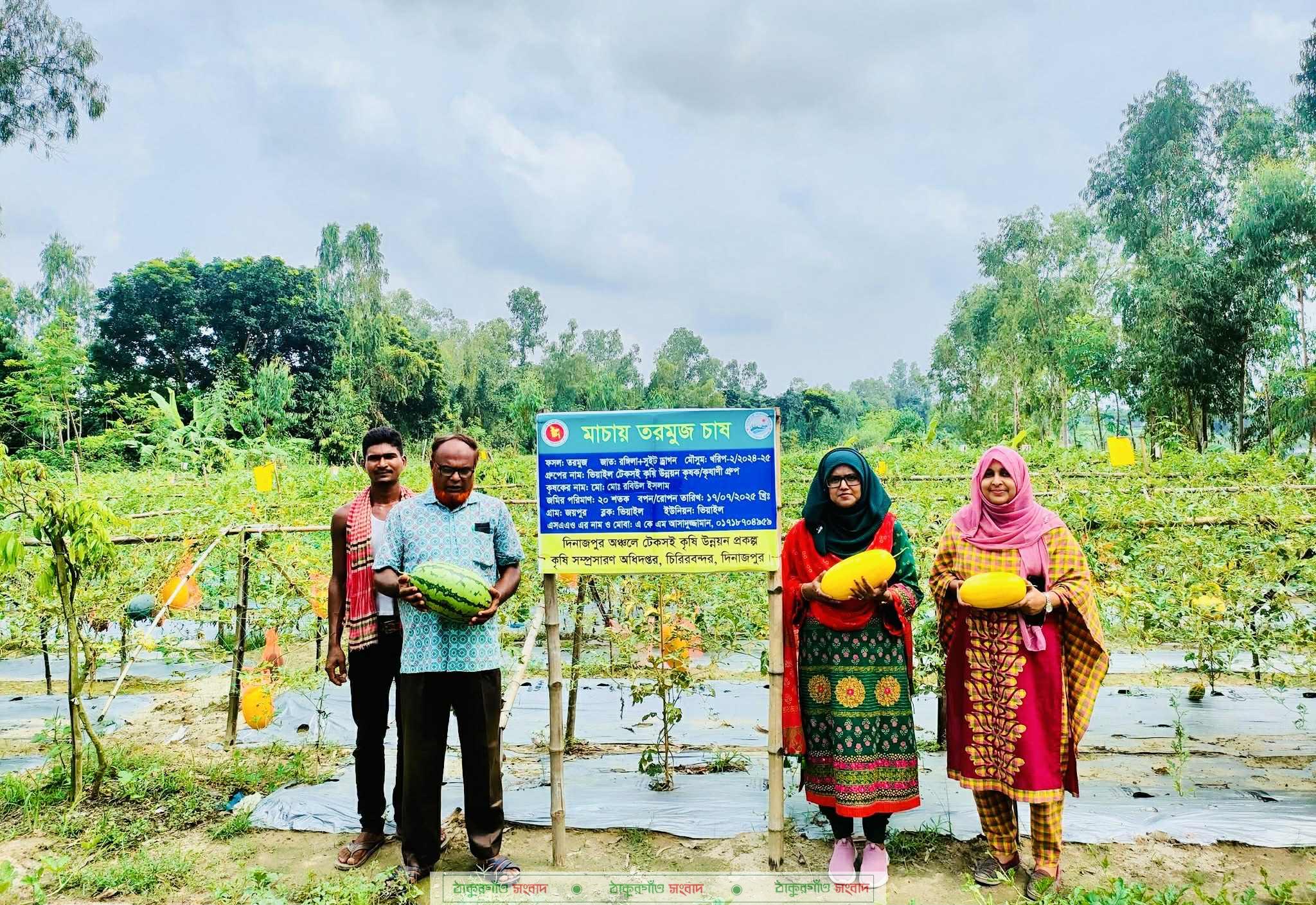 চিরিরবন্দর (দিনাজপুর) প্রতিনিধি: দিনাজপুরের চিরিরবন্দরে মাচায় গ্রীষ্মকালীন তরমুজ চাষ করে সাফল্য পেয়েছেন চাষিরা। মাত্র ৭০-৯০দিনের মধ্যে ফসল ঘরে তুলতে পারায় তারা লাভবান হচ্ছেন। গ্রীষ্মকালীন তরমুজ চাষে নতুন সম্ভাবনার দিগন্ত উন্মোচন করেছেন কৃষকেরা। আধুনিক কৃষি প্রযুক্তি, উন্নত জাত ব্যবহার ও স্থানীয় কৃষি বিভাগের পরামর্শে এ অঞ্চলের কৃষকরা গরমকালেও উচ্চ ফলনশীল তরমুজ উৎপাদন করে লাভবান হচ্ছেন। কৃষি বিভাগ দাবি করেছেন, এ পদ্ধতি জনপ্রিয় ও পরিধি বৃদ্ধি হলে স্থানীয় কৃষি অর্থনীতি আরো সমৃদ্ধশালী হবে।