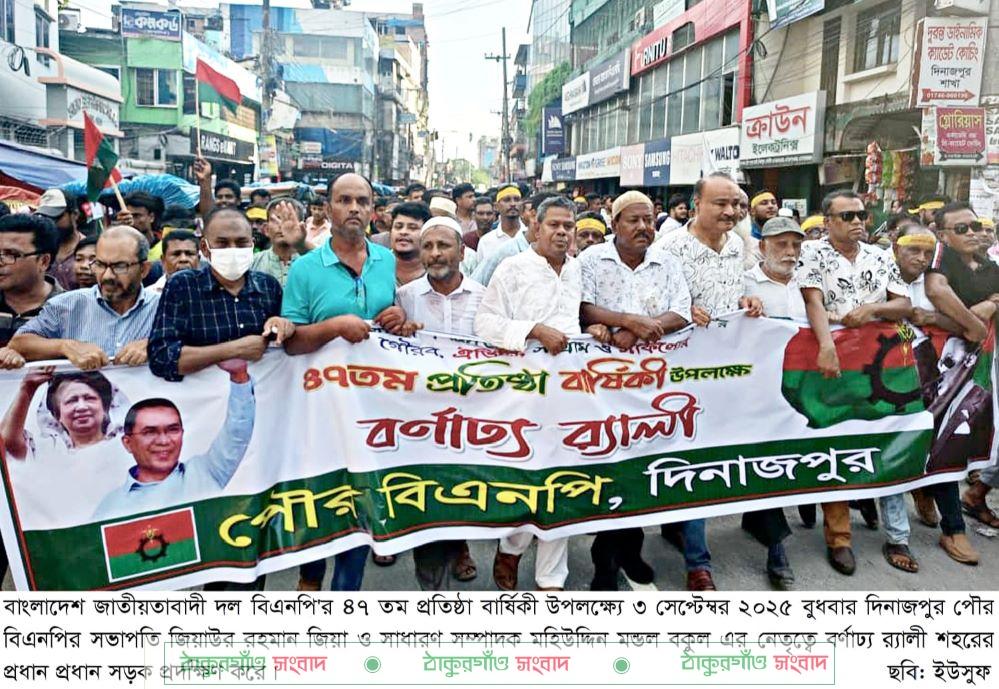 বাংলাদেশ জাতীয়তাবাদী দল বিএনপি’র ৪৭ তম প্রতিষ্ঠাবার্ষিকী উপলক্ষ্যে জেলা বিএনপি’র দলীয় কার্যালয় থেকে বুধবার বিকেলে দিনাজপুর পৌর বিএনপি’র আয়োজনে বর্ণাঢ্য র্যালী বের হয়ে শহরের গুরুত্বপূর্ণ সড়ক প্রদক্ষিণ শেষে পুনরায় দলীয় কার্যালয়ে গিয়ে মিলিত হয়।