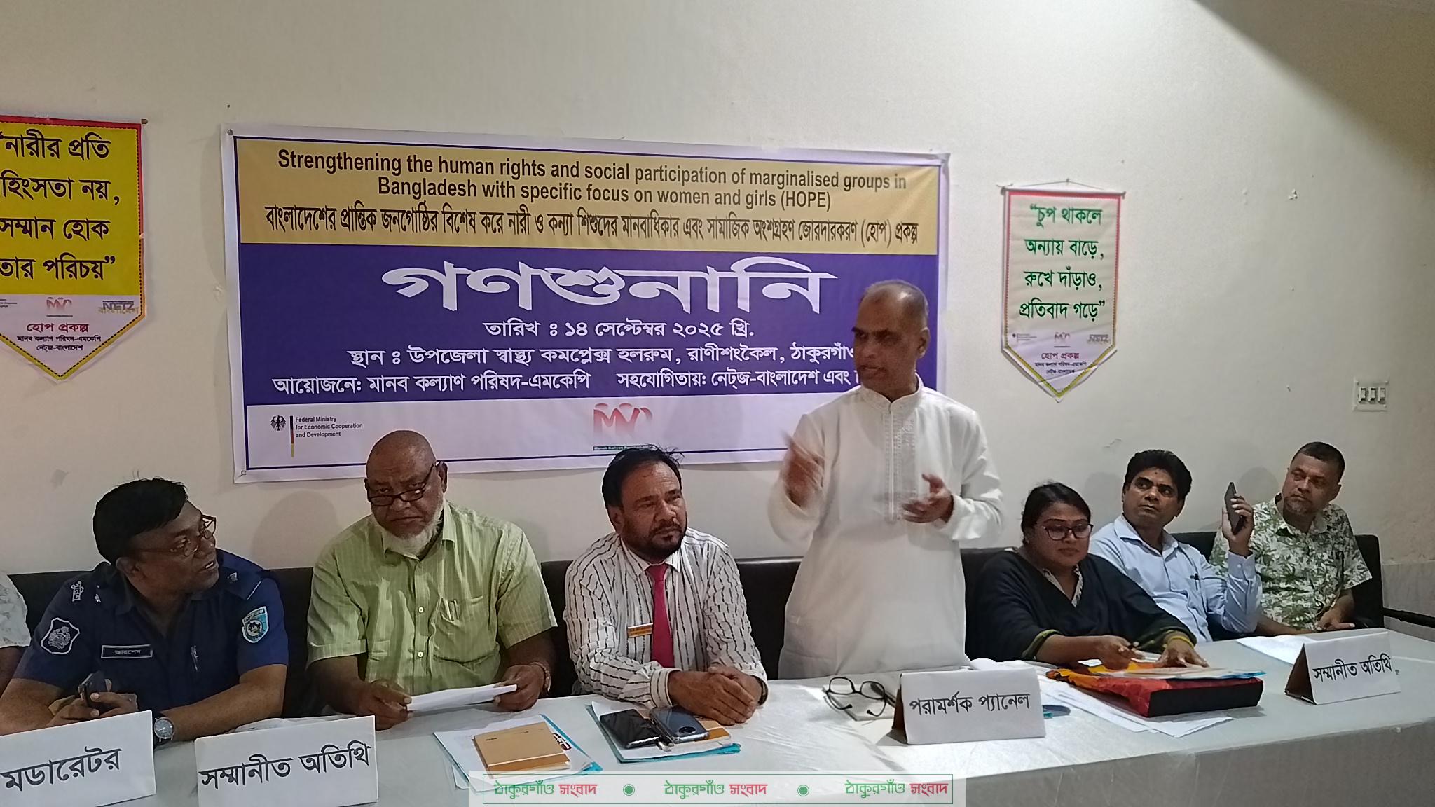 রাণীশংকৈল (ঠাকুরগাঁও) প্রতিনিধিঃ ঠাকুরগাঁওয়ের রাণীশংকৈল উপজেলা হাসপাতাল হলরুমে রবিার (১৪ সেপ্টেম্বর) মানব কল্যাণ পরিষদের আয়োজনে দেশের প্রান্তিক জনগোষ্ঠির নারী ও কন্যাশিশুদের মানবাধিকার ও সামাজিক অংশগ্রহণ জোরদারকরণে গণশুনানি অনুষ্ঠিত হয়।
