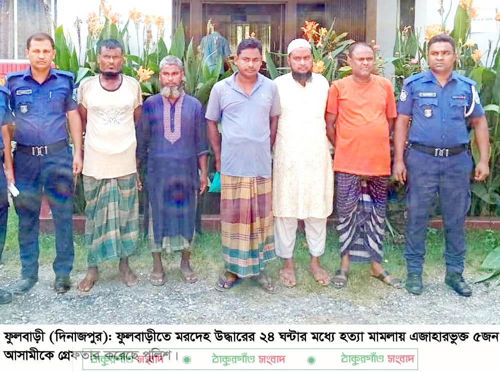 ফুলবাড়ী (দিনাজপুর) প্রতিনিধি\দিনাজপুরের ফুলবাড়ীতে মরদেহ উদ্ধারের ২৪ ঘন্টার মধ্যে হত্যা মামলায় এজাহারভুক্ত ৫জন আসামীকে গ্রেফতার করেছে পুলিশ। গত শুক্রবার দিবাগত ভোর রাতে উপজেলার বিভিন্ন এলাকায় অভিযান চালিয়ে তথ্য প্রযুক্তির সহায়তায় তাদের গ্রেফতার করা হয়। এর আগে গত বৃহস্পতিবার (২৫ সেপ্টেম্বর) বিকেল সাড়ে ৪টায় নিখোঁজের দুইদিন পর উপজেলার কাজিহাল ইউনিয়নের রশিদপুর গ্রামের একটি ধান খেতের ডোবা থেকে এক যুবকের মস্তকবিহীন দ্বীখন্ডিত মরদেহ উদ্ধার করা হয়। তবে মরদেহের মস্তক এখোনো উদ্ধার করা সম্ভব হয়নি।
