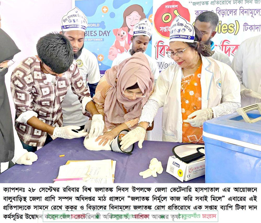 রবিবার বিশ্ব জলাতঙ্ক দিবস উপলক্ষে জেলা ভেটেনারি হাসপাতাল এর আয়োজনে বালুবাড়িস্থ জেলা প্রাণি সম্পদ অধিদপ্তর মাঠ প্রাঙ্গনে “জলাতঙ্ক নির্মূলে কাজ করি সবাই মিলে” এবারের এই প্রতিপাদ্যকে সামনে রেখে কুকুর ও বিড়ালের বিনামূল্যে জলাতঙ্ক রোগ প্রতিরোধে এক সপ্তাহ ব্যাপি টিকা দান কর্মসূচির উদ্বোধন করা হয়েছে।