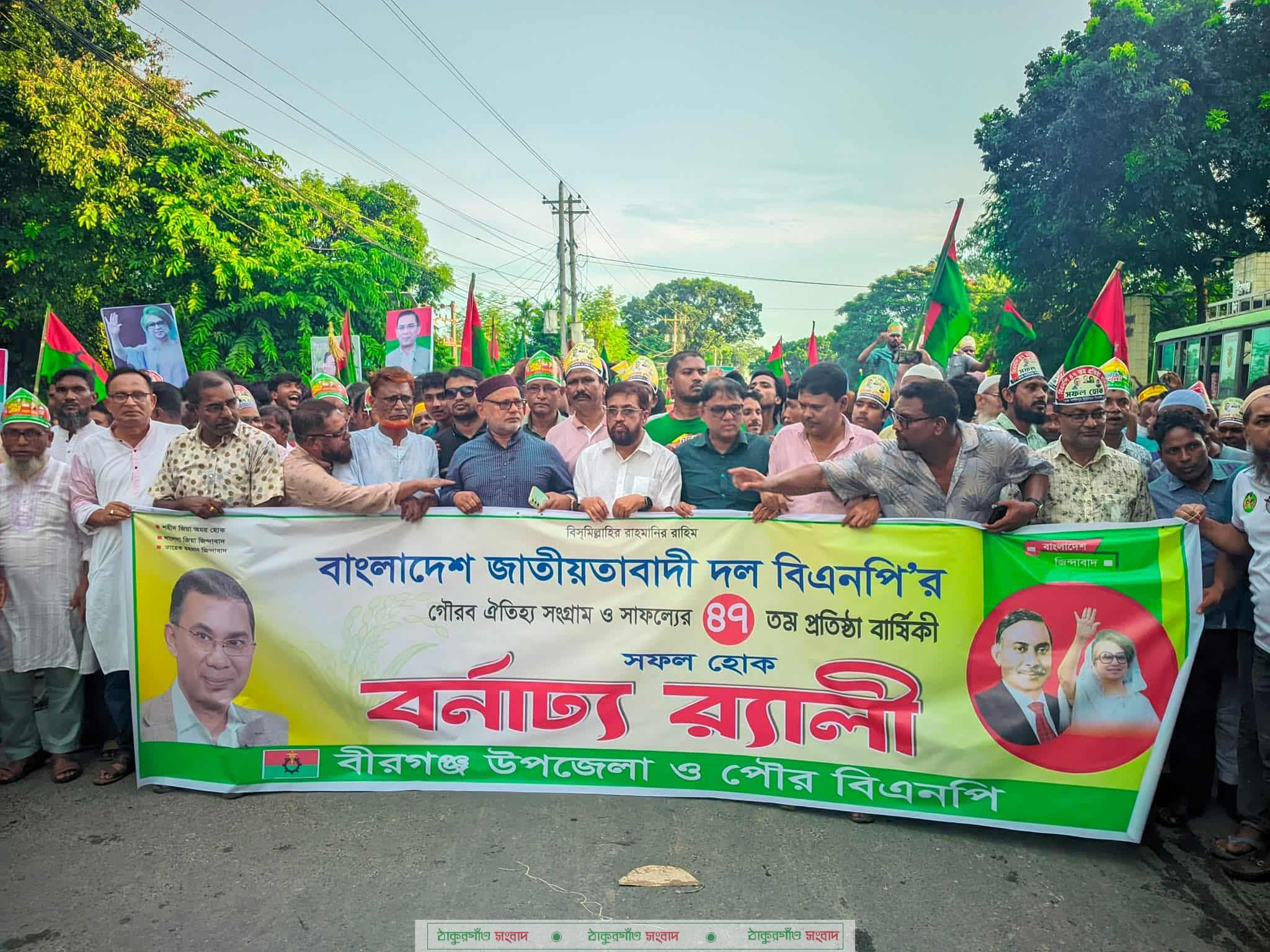 বাংলাদেশ জাতীয়তাবাদী দল বিএনপির গৌরব-ঐতিহ্য সংগ্রাম ও সাফল্যের ৪৭ তম প্রতিষ্ঠা বার্ষিকী উপলক্ষ্যে দিনব্যাপী উৎসব মুখর পরিবেশে দিনাজপুরের বীরগঞ্জে বর্ণাঢ্য র্যালী ও আলোচনা সভা অনুষ্ঠিত হয়েছে।