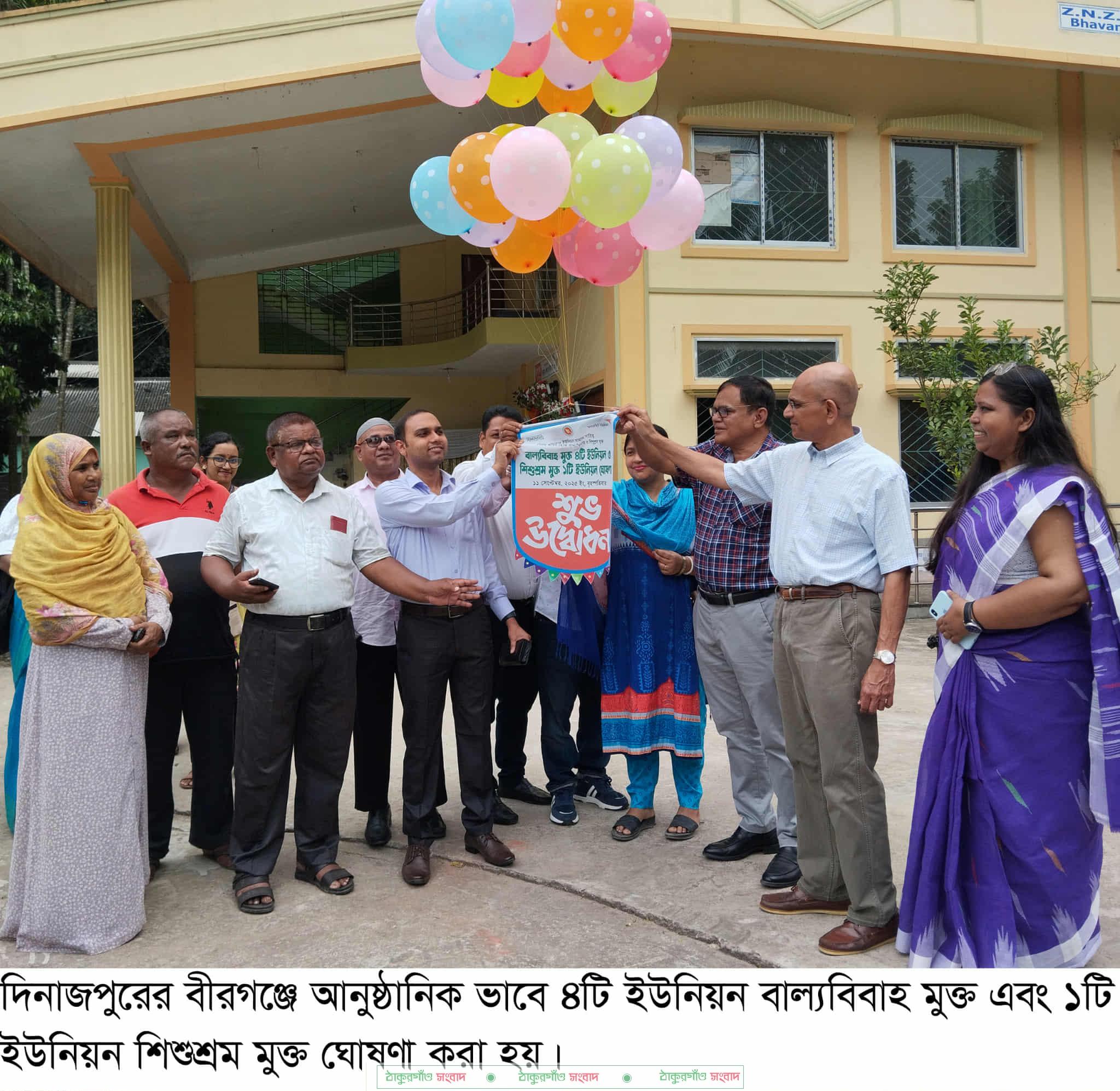 বীরগঞ্জ (দিনাজপুর) প্রতিনিধি: আমার ইউনিয়ন আমার দার্য়িত্ব শিশুর জীবন হোক বাল্যবিবাহ ও শিশুশ্রম মুক্ত এই প্রতিপাদ্য বিষয়কে সামনে রেখে দিনাজপুরের বীরগঞ্জ উপজেলার চারটি ইউনিয়নকে বাল্যবিবাহ এবং একটি ইউনিয়নকে শিশুশ্রম মুক্ত ঘোষণা করা হয়েছে।