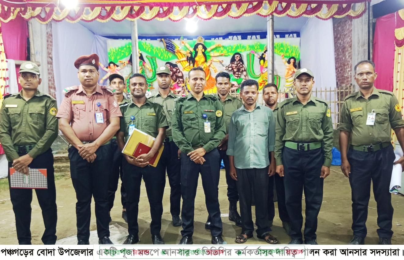 পঞ্চগড় প্রতিনিধি\বাংলাদেশের সনাতন ধর্মাবলম্বীদের প্রধান ধর্মীয় উৎসব শারদীয় দুর্গাপূজা নিরাপদ ও নির্বিঘœভাবে উদযাপনের লক্ষ্যে বাংলাদেশ আনসার ও গ্রাম প্রতিরক্ষা বাহিনী ব্যাপক নিরাপত্তা ব্যবস্থা গ্রহণ করেছে। এরই অংশ হিসেবে পঞ্চগড়ের বোদা উপজেলায় ৯৩টি পূজামÐপে দায়িত্ব পালন করছেন ৬১০ জন প্রশিক্ষণপ্রাপ্ত আনসার-ভিডিপি সদস্য। গত ২৪ সেপ্টেম্বর থেকে শুরু হয়ে আগামী ২ অক্টোবর পর্যন্ত টানা নয় দিন তারা দায়িত্ব পালন করবেন।
