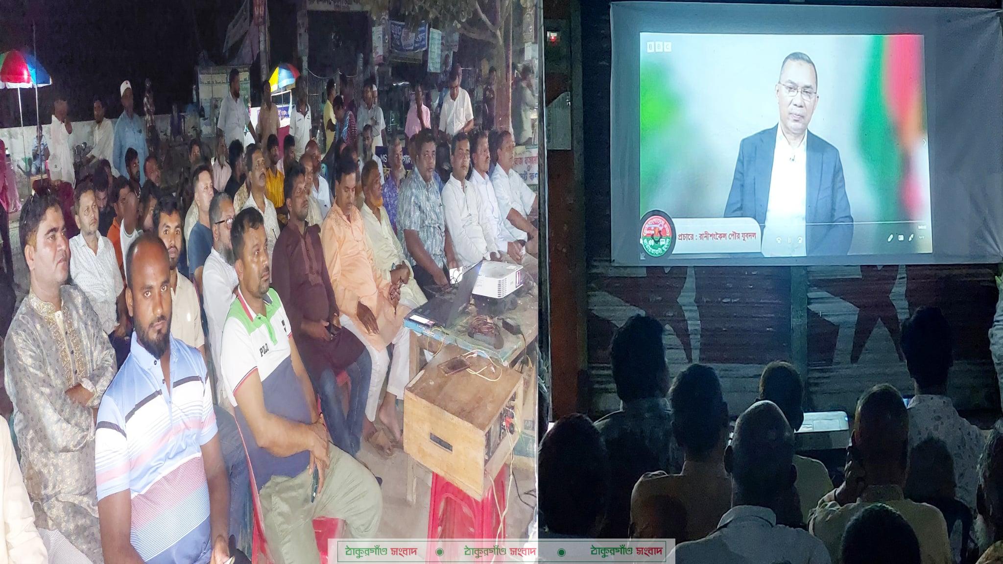 গতকাল সন্ধায় রাণীশংকৈল পৌর যুবদলের আয়োজনে রাণীশংকৈল ডিগ্রি কলেজের ম‚ল ফটকের সামনে ডিজিটাল প্রজেক্টরের মাধ্যমে বড় পর্দায় ওই সাক্ষাৎকারটি প্রদর্শন করা হয়। এ প্রদর্শনীতে উপস্থিত ছিলেন, পৌর বিএনপির সভাপতি শাহাজাহান আলী,সম্পাদক মহসিন আলী, উপজেলা বিএনপি’র যুগ্ম সম্পাদক অধ্যাপক মনিরুজ্জামান মনি, সাংগঠনিক সম্পাদক এম আর বকুল মজুমদার, উপজেলা যুবদলের সাবেক সম্পাদক আকতারুল ইসলাম আক্তার, পৌর যুবদলের সাবেক সভাপতি ফারুক হোসেন, সম্পাদক মমিরুল ইসলাম মমিন,সাংগঠনিক সম্পাদক মুক্তারুল ইসলাম, পৌর বিএনপির সাংগঠনিক সম্পাদক সাদেকুল ইসলাম,জিয়া পরিষদের আহŸায়ক শরিফ উদ্দিন মাস্টার, ওয়ার্ড সভাপতি গোলাম রসুল, আবুল কাশেম, ওয়ার্ড সম্পাদক মোবারক আলী, উপজেলা আ’লীগের তথ্য ও গবেষনা সম্পাদক প্রভাষক প্রশান্ত বসাকসহ বিপুল সংখ্যক মানুষ। এসময় পৌর যুবদলের সম্পাদক,মমিরুল ইসলাম মমিন বলেন, “বিএনপি ভারপ্রাপ্ত চেয়ারম্যান তারেক রহমান দীর্ঘ ১৭ বছর পর প্রথমবারের মতো এ সাক্ষাৎকার দিয়েছেন। তা সবার মাঝে পৌঁছে দিতে এমন উদ্যোগ নেওয় হয়েছে। এ প্রসঙ্গে উপজেলা বিএনপি’র সম্পাদক আল্লামা ওয়াদুদ বিন-নুর আলিফ এ প্রতিনিধিকে বলেন, জনাব তারেক রহমান সাক্ষাৎকারে যে কথা বলেছেন বলিষ্ঠ আতœবিশ^াসি অবস্থান থেকে। দলীয় নেতাকর্মি ও অনুসারিদের এটা উদ্দীপ্ত করবে। এজন্য এলাকার মানুষকে সাক্ষাৎকারটি সরাসরি দেখানোর ব্যবস্থা করেছি।