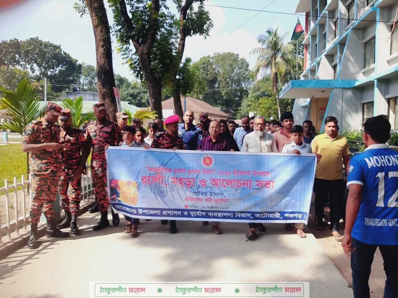 আটোয়ারী(পঞ্চগড়) প্রতিনিধি ঃ “ সমন্বিত উদ্যোগ, প্রতিরোধ করি দুর্যোগ ” প্রতিপাদ্য বিষয় নিয়ে পঞ্চগড়ের আটোয়ারীতে র্যালি, আলোচনা সভা ভূমিকম্প ও অগ্নিকান্ডে করণীয় বিষয়ক মহড়ার মধ্য দিয়ে আন্তর্জাতিক দুর্যোগ প্রশমন দিবস-২০২৫ উদযাপন করা হয়েছে। এ উপলক্ষে উপজেলা প্রশাসন ও দুর্যোগ ব্যবস্থাপনা বিভাগের আয়োজনে সোমবার ( ১৩ অক্টোবর) সকালে উপজেলা পরিষদ চত্বর থেকে একটি র্যালি বের করা হয়। র্যালি শেষে উপজেলা পরিষদ চত্বরে আলোচনা ও ফায়ার সার্ভিসের মহড়া অনুষ্ঠিত হয়। অনুষ্ঠানে উপজেলা নির্বাচন অফিসার মোঃ শাজাহান মানিক এর সভাপতিত্বে প্রতিপাদ্য বিষয়ের উপর গুরুত্বারোপ করে বক্তব্য রাখেন ,সহকারী উপজেলা মাধ্যমিক শিক্ষা অফিসার মোঃ জাহিদুল ইসলাম, আটোয়ারী থানার এসআই মোঃ আশাদুল হক, উপজেলা নির্বাহী অফিসারের কার্যালয়ের উপ প্রশাসনিক কর্মকর্তা মোঃ রুস্তম আলী, আটোয়ারী ফায়ার সার্ভিস ও সিভিল ডিফেন্স স্টেশনের সহকারী ইনচার্জ মোঃ হারুন অর রশিদ, লিডার বিপ্লব হোসেন, উপজেলা প্রেসক্লাবের সভাপতি মোঃ ইউসুফ আলী প্রমুখ। বক্তারা বলেন, দুর্যোগ দুই প্রকার- মানবসৃষ্ট ও প্রাকৃতিকসৃষ্ট। প্রাকৃতিক দুর্যোগ মোকাবিলায় সবাইকে সম্মিলিতভাবে এগিয়ে আসতে হবে। তাছাড়া মানবসৃষ্ট দুর্যোগ নিরসনে সবাইকে সচেতন হতে হবে। দুর্যোগ বিষয়ে সময়োপযোগী ব্যবস্থা গ্রহণ করতে হবে। সর্বোপরি বৈশ্বিক জলবায়ু পরিবর্তন মোকাবেলায় সবাইকে সচেতন থাকতে হবে। সভাপতির বক্তব্যে নির্বাচন অফিসার বলেন, দুর্যোগ মোকাবিলায় কেবল সরকার নয়, প্রতিটি নাগরিকের সচেতনতা ও অংশগ্রহণ অপরিহার্য। পরিবার ও সমাজস্তরে দুর্যোগ প্রস্তুতি এবং সময় মতো সঠিক পদক্ষেপই পারে প্রাণহানি ও ক্ষয়ক্ষতি অনেকটা কমিয়ে আনতে। তাই আজকের দুর্যোগ প্রশমন দিবস হোক ব্যক্তি, সমাজ ও রাষ্ট্রের সমন্বিত সচেতনতার নতুন অঙ্গিকার। আলোচনা শেষে উপজেলা পরিষদ চত্বরে ফায়ার সার্ভিস এন্ড সিভিল ডিফেন্স এর সহকারী ইনচার্জ মোঃ হারুন অর রশিদের নেতৃত্বে ফায়ার সার্ভিস কর্মীদের একটি চৌকশদল সকলকে সচেতনতার লক্ষ্যে অগ্নিকান্ড সহ বিভিন্ন দুর্যোগ প্রশমনে করণীয় কৌশল সম্পর্কিত মহড়া প্রদর্শন করেন। অনুষ্ঠানে বিভিন্ন দপ্তরের কর্মকর্তা-কর্মচারী, ফায়ার সার্ভিস এন্ড সিভিল ডিফেন্স, পুলিশ,আনসার, শিক্ষক-শিক্ষার্থীসহ গণমাধ্যমকর্মীগণ উপস্থিত ছিলেন।