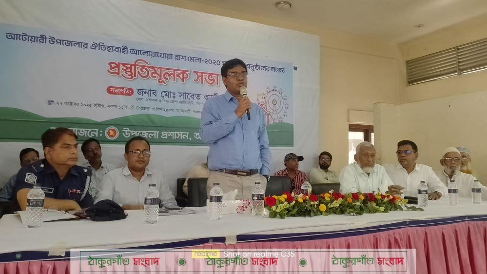 আটোয়ারী(পঞ্চগড়) প্রতিনিধি ঃ পঞ্চগড়ের ঐতিহ্যবাহী ও ঐতিহাসিক আটোয়ারী আলোয়াখোয়া রাশ মেলা-২০২৫ আয়োজন উপলক্ষে প্রস্তুতিমূলক সভা অনুষ্ঠিত হয়েছে। সোমবার ( ২৭ অক্টোবর) দুপুরে উপজেলা প্রশাসনের আয়োজনে উপজেলা পরিষদ অডিটোরিয়ামে প্রস্তুতিমূলক সভা অনিুষ্ঠিত হয়। এ সময় উপজেলা পরিষদের সাবেক ভাইস চেয়ারম্যান মোঃ শাহাজাহান’কে কন্ঠভোটে সর্বসম্মতিক্রমে আলোয়াখোয়া রাশ মেলা-২০২৫ এর সাধারণ সম্পাদক নির্বাচিত করা হয়। পঞ্চগড় জেলা প্রশাসক মোঃ সাবেত আলী’র সভাপতিত্বে এবং উপজেলা একাডেমিক সুপারভাইজার মোঃ রেজাউন নবী রাজা’র সঞ্চালনায় প্রস্তুতিমূলক সভায় স্বাগত বক্তব্য রাখেন, উপজেলা নির্বাহী অফিসার মোঃ আরিফুজ্জামান। ২০২৪ সালের আলোয়াখোয়া রাশ মেলার আয়-ব্যয় হিসাব নিকাশ উপস্থাপন করেন মেলার সাবেক সাধারণ সম্পাদক ও উপজেলা বিএনপি’র সাধারণ সম্পাদক মোঃ নজরুল ইসলাম দুলাল। অন্যান্যদের মধ্যে বক্তব্য রাখেন, আটোয়ারী থানার অফিসার ইনচার্জ মোঃ রফিকুল ইসলাম সরকার (জুয়েল), উপজেলা বিএনপি’র সভাপতি এ.জেড.এম বজলুর রহমান (জাহেদ), বাংলাদেশ জামায়াতে ইসলামী আটোয়ারী উপজেলা শাখার আমীর মাও ঃ মোঃ ইউনুস আলী খাঁন, সাবেক উপজেলা মুক্তিযোদ্ধা কমন্ডার আলহাজ্ব মোঃ নজরুল ইসলাম, আটোয়ারী উপজেলা প্রেসক্লাবের সভাপতি মোঃ ইউসুফ আলী, বণিক সমিতির সভাপতি কমলেশ চন্দ্র ঘোষ, রাশ পূজা কমিটির পক্ষ থেকে রঞ্জন ঘোষ হিরু, বিএনপি তোড়িয়া ইউনিয়ন কমিটির সভাপতি আতাউর রহমান, ব্যবসায়ী আব্দুল খালেক , পল্লী প্রাণি চিকিৎসক আব্দুল কাদের প্রমুখ। প্রস্তুতিমূলক সভার সিদ্ধান্ত মতে, মেলা আগামী ২০ নভেম্বর- ২০২৫ উদ্বোধন হয়ে চলবে ১৩ ডিসেম্বর পর্যন্ত। তবে আগামী জাতীয় সংসদ নির্বাচনের তফসিল ঘোষনার উপর ভিত্তি করে মেলার মেয়াদ বাড়তে পারে। প্রতিবারের ন্যায় এবারো আলোয়াখোয়া মেলায় গরু, মহিষ,ছাগল, ভেড়া, ঘোড়া ,কাঠ ও স্টীলের আসবাবপত্রসহ নিত্য প্রয়োজনীয় সামগ্রীর বিপুল সমাহার থাকবে। এছাড়াও মনোমুগ্ধকর সুস্থ বিনোদনের পর্যাপ্ত ব্যবস্থা থাকবে। মেলার সভাপতি জেলা প্রশাসক মোঃ সাবেত আলী ও সাধারণ সম্পাদক উপজেলা পরিষদের সাবেক ভাইস চেয়ারম্যান মোঃ শাহাজাহান সুশৃঙ্খল পরিবেশে মেলা পরিচালনার ক্ষেত্রে দল মত নির্বেশেষে সবার সহযোগিতা কামনা করেছেন। এ সময় পুলিশ, বিজিবি, আনসার বাহিনীর প্রতিনিধি, উপজেলা বিএনপি, জামায়াতে ইসলামী, জাসদ, জাগপা,এনসিপি, গণ অধিকার পরিষদ, বিভিন্ন রাজনৈতিক দলের নেতৃবৃন্দ, ব্যবসায়ী, মুক্তিযোদ্ধা, গণমাধ্যমকর্মীসহ বিভিন্ন শ্রেণি পেশার মানুষ উপস্থিত ছিলেন।