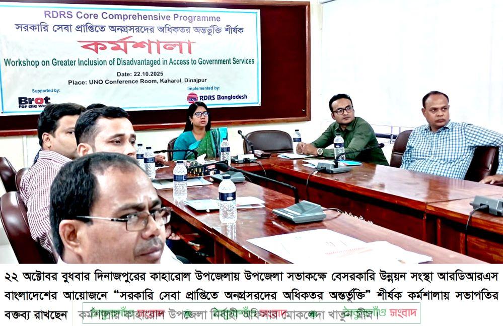 বুধবার দিনাজপুরের কাহারোল উপজেলায় উপজেলা সভাকক্ষে বেসরকারি উন্নয়ন সংস্থা আরডিআরএস বাংলাদেশের আয়োজনে “সরকারি সেবা প্রাপ্তিতে অনগ্রসরদের অধিকতর অন্তর্ভুক্তি” শীর্ষক কর্মশালা অনুষ্ঠিত হয়েছে।