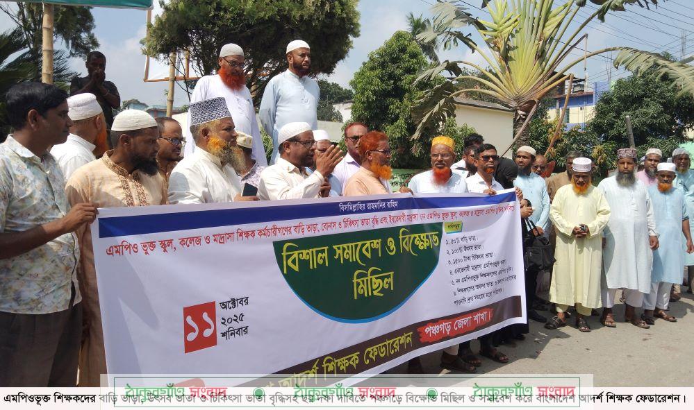 এমপিওভ‚ক্ত স্কুল, কলেজ ও মাদ্রাসা শিক্ষক কর্মচারীদের শতকরা ৫০ ভাগ বাড়ি ভাড়া, শতভাগ উৎসব ভাতা, এক হাজার পাঁচশত টাকা চিকিৎসা ভাতাসহ ছয় দফা দাবিতে পঞ্চগড়ে বিক্ষোভ মিছিল ও সমাবেশ করেছে বাংলাদেশ আদর্শ শিক্ষক ফেডারেশন পঞ্চগড় জেলা শাখা। গতকাল শনিবার সকালে সকালে পঞ্চগড় জেলা জজ কোর্টের সামনে থেকে একটি বিক্ষোভ মিছিল বের হয়ে পঞ্চগড়-বাংলাবান্ধা মহাসড়ক ধরে জেলা শহরের চৌরঙ্গী মোড়ে এসে শেষ হয়। পরে সেখানে সমাবেশ অনুষ্ঠিত হয়। এ সময় বক্তব্য দেন বাংলাদেশ আদর্শ শিক্ষক ফেডারেশন পঞ্চগড় জেলা শাখার সভাপতি মো. অলিউল্ল্যাহ, কলেজ শিক্ষক ফেডারেশনের সভাপতি মো. মাসুদ, ইবতেদায়ী ফেডারেশনের সভাপতি মো. মাজেদুর রহমান, সদস্য জয়নাল আবেদীন প্রমূখ।