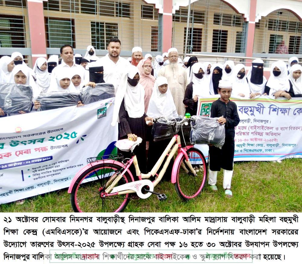 সোমবার নিমনগর বালুবাড়ীস্থ দিনাজপুর বালিকা আলিম মাদ্রাসায় বালুবাড়ী মহিলা বহুমুখী শিক্ষা কেন্দ্র (এমবিএসকে)’র আয়োজনে এবং পিকেএসএফ-ঢাকা’র নির্দেশনায় বাংলাদেশ সরকারের উদ্যোগে তারুণের উৎসব-২০২৫ উপলক্ষ্যে গ্রাহক সেবা পক্ষ ১৬ হতে ৩০ অক্টোবর উদযাপন উপলক্ষ্যে দিনাজপুর বালিকা আলিম মাদ্রাসা’র ছাত্রীদের মাঝে বাই সাইকেল ও স্কুল ব্যাগ বিতরণ করা হয়েছে।