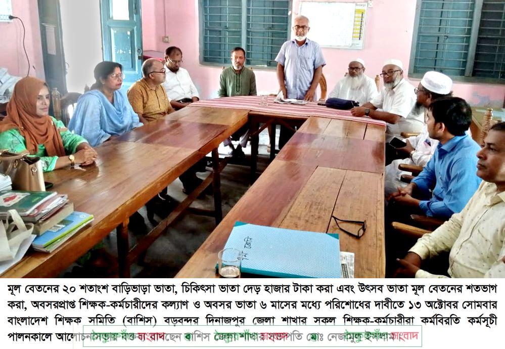 মূল বেতনের ২০ শতাংশ বাড়িভাড়া ভাতা, চিকিৎসা ভাতা দেড় হাজার টাকা করা এবং উৎসব ভাতা মূল বেতনের শতভাগ করা, অবসরপ্রাপ্ত শিক্ষক-কর্মচারীদের কল্যাণ ও অবসর ভাতা ৬ মাসের মধ্যে পরিশোধের দাবীতে জাতীয় প্রেসক্লাব ঢাকায় আন্দোলনরত এমপিওভুক্ত শিক্ষক-কর্মচারীদের অবস্থান কর্মসূচীতে পুলিশের সাউন্ড গ্রেনেড ও জল কামান নিক্ষেপ করার প্রতিবাদে কেন্দ্রীয় ঘোষিত কর্মসূচীর আলোকে ১৩ অক্টোবর সোমবার হতে অনির্দিষ্টকালের জন্য বাংলাদেশ শিক্ষক সমিতি (বাশিস) বড়বন্দর দিনাজপুর জেলা শাখার সকল শিক্ষক-কর্মচারীরা কর্মবিরতি কর্মসূচী পালন করছে।