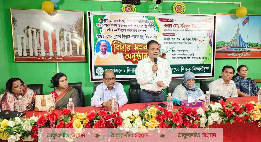 বৃহস্পতিবার বিকেল সাড়ে ৪ টায় দিনাজপুর জুবিলী উচ্চ বিদ্যালয়ের প্রধান শিক্ষক তপন কুমার বিশ্বাস (বুনু বিশ্বাস) -এর বিদায় ও সংবর্ধনা অনুষ্ঠিত হয়েছে। অত্র বিদ্যালয়ের প্রধান শিক্ষক বুনু বিশ্বাস দীর্ঘ ৩২ বছর ধরে নিষ্ঠার সাথে তার দায়িত্ব পালন করে আসছেন। অনুষ্ঠিত এই বিদায় ও সংবর্ধনা অনুষ্ঠানে প্রধান অতিথি হিসেবে উপস্থিত ছিলেন দিনাজপুর যুবলী উচ্চ বিদ্যালয় এর সভাপতি ও দিনাজপুর জেলা প্রশাসক মোঃ রফিকুল ইসলাম। অনুষ্ঠিত বিদায় ও সংবর্ধনা অনুষ্ঠানে দিনাজপুর সদর উপজেলা মাধ্যমিক শিক্ষা কর্মকর্তা মোছাঃ শাকেরিনা বেগম -এর সভাপতিত্বে অন্যান্য অতিথিদের মধ্যে উপস্থিত ছিলেন দিনাজপুর সদর উপজেলা মাধ্যমিক একাডেমিক সুপারভাইজার নির্মল কুমার রায়, উপজেলা রাজবাটি সরকারি শিশু পরিবারের উপ তত্ত¡াবধায়ক মাহমুদা নুসরাত জাহান, সারদেশ্বরি বালিকা উচ্চ বিদ্যালয়ের প্রধান শিক্ষক রতন কুমার রায়, তফিউদ্দিন মেমোরিয়াল হাই স্কুলের ভারপ্রাপ্ত প্রধান শিক্ষক মোঃ শহীদুজ্জামান, বরাইপুর উচ্চ বিদ্যালয় এর সাবেক প্রধান শিক্ষক মোঃ মিজানুর রহমান, ঈদগাহ বালিকা উচ্চ বিদ্যালয়ের প্রধান শিক্ষক মোঃ ফজলুর রহমান, রাজবাটি সরকারি প্রাথমিক বিদ্যালয়ের প্রধান শিক্ষিকা সাবিনা ইয়াসমিন। অত্র প্রতিষ্ঠানের সহকারী শিক্ষক অব্রাহাম দাস এর সঞ্চালনায় অন্যান্যদের মধ্যে উপস্থিত ছিলেন দিনাজপুর জুবিলী উচ্চ বিদ্যালয় এর সহকারী প্রধান শিক্ষক মোঃ আকরাম হোসেন বাবলু, সিনিয়র শিক্ষক আবুল কাশেম, মোছাঃ সুফিয়া বেগম, মোঃ শহীদুজ্জামান চৌধুরী, বধির ইনস্টিটিউটের প্রধান শিক্ষক নাজনীন আক্তার, এলাকার গণ্যমান্য ব্যক্তির বর্গের মধ্যে