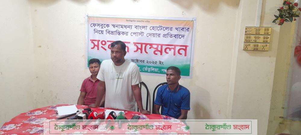 মঙ্গলবার (২৮ অক্টোবর) বিকেলে তেঁতুলিয়া উপজেলার চৌরাস্তা বাজারে অবস্থিত বাংলা হোটেলের দিত্বীয়তলায় অনুষ্ঠিত সংবাদ সম্মেলনে মালিক পক্ষের পক্ষ থেকে আজিজুল হক ও আক্তার হোসেন উপস্থিত ছিলেন। কর্মচারীদের পক্ষ থেকে রফিকুল ইসলাম নিজ নিজ বক্তব্য তুলে ধরেন। তারা দাবি করেন আমাদের ব্যবসা প্রতিষ্ঠানকে নিয়ে ভিত্তিহীন তথ্য প্রচার করা হচ্ছে। দুই দশকেরও বেশি সময় ধরে সুনামের সঙ্গে পরিচালিত এই হোটেল স¤প্রতি কিছু ইউটিউবারের নেতিবাচক ভিডিওর কারণে নানা আলোচনা ও সমালোচনার জন্ম দেয়।
