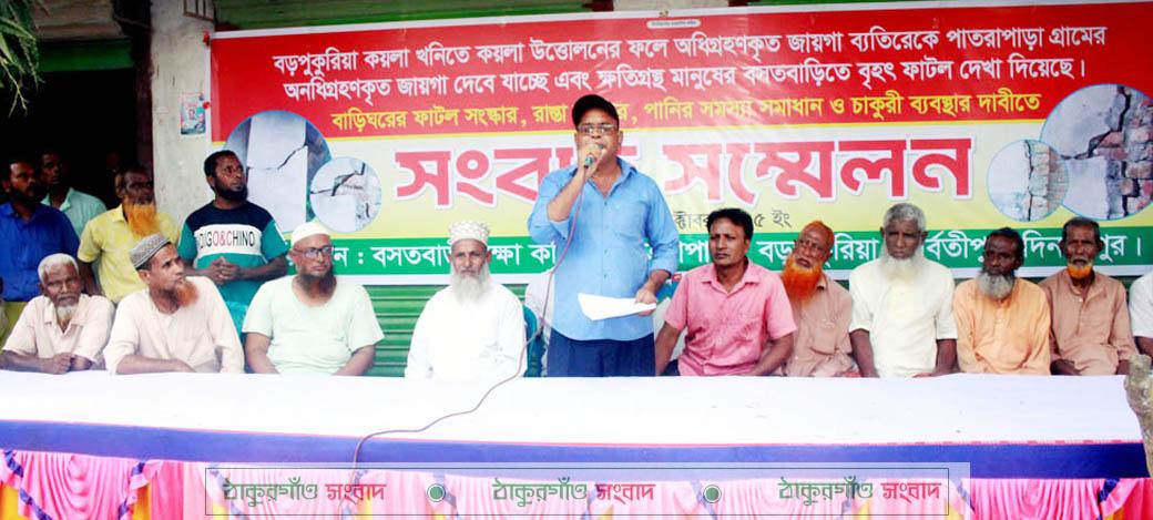 সংবাদ সম্মেলনে লিখিত বক্তব্যে বসত বাড়ী রক্ষা কমিটির সভাপতি নুর মোহাম্মদ আবুল কালাম আজাদ বলেন, বড়পুকুরিয়া কয়লাখনি এলাকার পাথরাপাড়া গ্রামের অনধিকৃত জায়গা কয়লা তোলার ফলে বাড়ীঘর আবাদী জমি, রাস্তাঘাট, দেবে যাচ্ছে। দীর্ঘদিন ধরে বড়পুকুরিয়া কয়লাখনি কর্তৃপক্ষকে বিষয়টি অবগত করলে, তারা এই এলাকায় নাম মাত্র সার্ভে করে কিছু ফাঁটল বাড়ীর ক্ষতিপূরণ প্রদান করেছেন। বর্তমানে এমনি অবস্থা দাঁড়িয়েছে যে গভীর রাতে আমরা গ্রামবাসীরা ঘুমাতে পারছি না। যে কোন মুহূর্তে আমাদের বাড়ীঘরসহ বিভিন্ন স্থাপনা তলিয়ে যেতে পারে।
