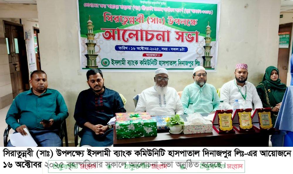 সিরাতুন্নবী (সাঃ) উপলক্ষ্যে ইসলামী ব্যাংক কমিউনিটি হাসপাতাল দিনাজপুর লিঃ-এর আয়োজনে বৃহস্পতিবার সকালে আলোচনা সভা অনুষ্ঠিত হয়েছে।