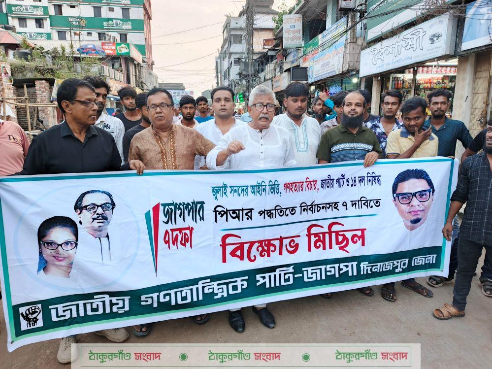 জুলাই সনদের আইনি ভিত্তি, গণহত্যার বিচার, জাতীয় পার্টি ও ১৪ দল নিষিদ্ধ, পিআর পদ্ধতিতে জাতীয় নির্বাচনসহ ৭ দফা দাবি বাস্তবায়নে ২৭ অক্টোবর ২০২৫ সোমবার বিকেলে, জাতীয় গণতান্ত্রিক পার্টি জাগপা দিনাজপুর জেলা শাখার উদ্যোগে বিক্ষোভ ও মিছিল অনুষ্ঠিত হয়েছে।