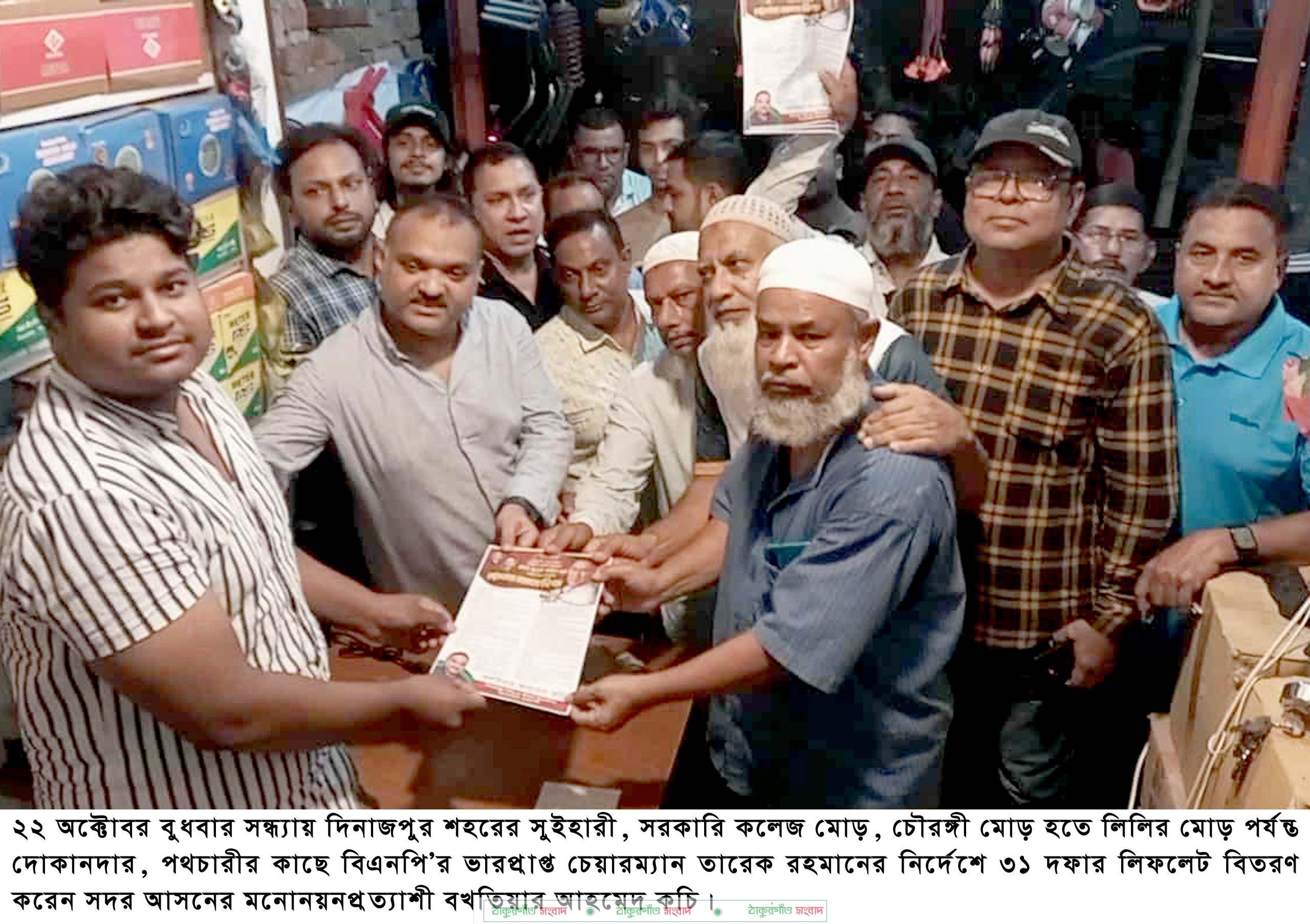 ২৩ অক্টোবর বৃহস্পতিবার বিকেলে বাংলাদেশ জাতীয়তাবাদী দল (বিএনপি)’র ভারপ্রাপ্ত চেয়ারম্যান তারেক রহমানের নির্দেশে ৩১ দফা লিফলেট বিতরণ কর্মসূচী পালনকালে বখতিয়ার আহমেদ কচি এসব কথা বলেন। এসময় দিনাজপুর সদর উপজেলার সুন্দরবন ইউনিয়নের বেলবাড়ী,রামডুবি, ব্যাংকালি, নতুনভ‚ষি, চাকারবাজার, রামডুবি মোড়, টেক্সটাইল বাজারসহ ইউনিয়নের বিভিন্ন এলাকায় লিফলেট বিতরণ করেন তিনি।