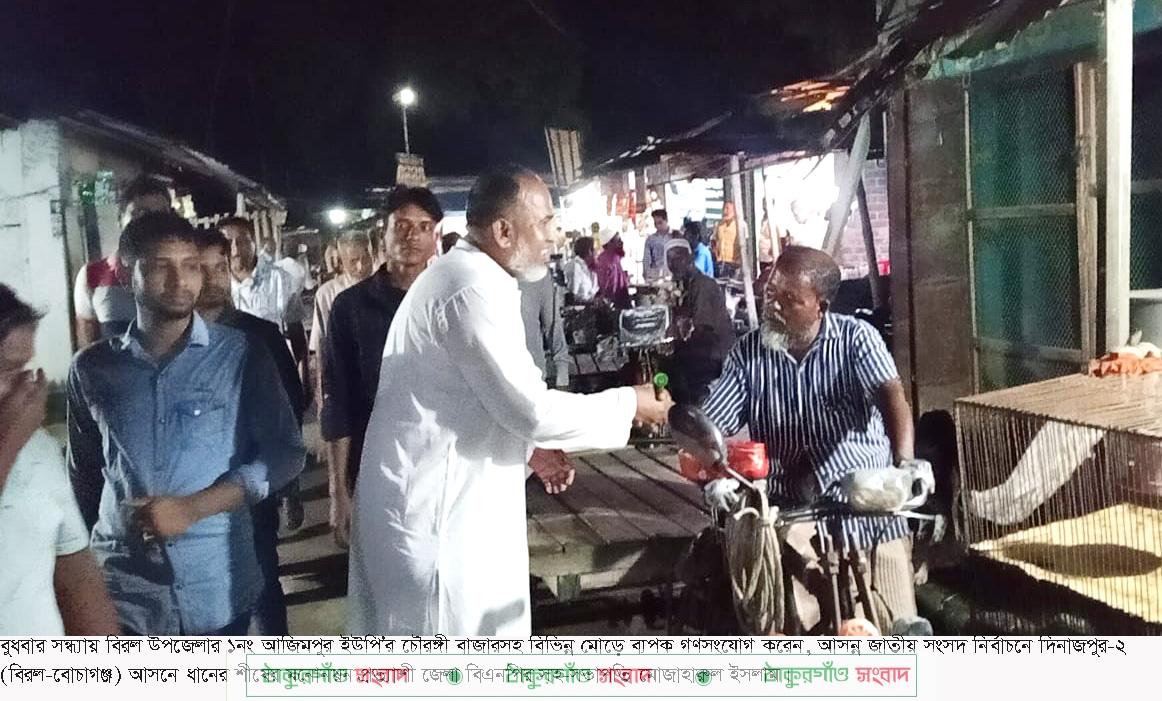 বিরল (দিনাজপুর) প্রতিনিধি \ নির্বাচনী এলাকায় দিন-রাত গনসংযোগে করে চলছেন আসন্ন জাতীয় সংসদ নির্বাচনে দিনাজপুর-২ (বিরল-বোচাগঞ্জ) আসনে ধানের শীষের মনোনয়ন প্রত্যাশী জেলা বিএনপির সহ-সভাপতি মোজাহারুল ইসলাম।