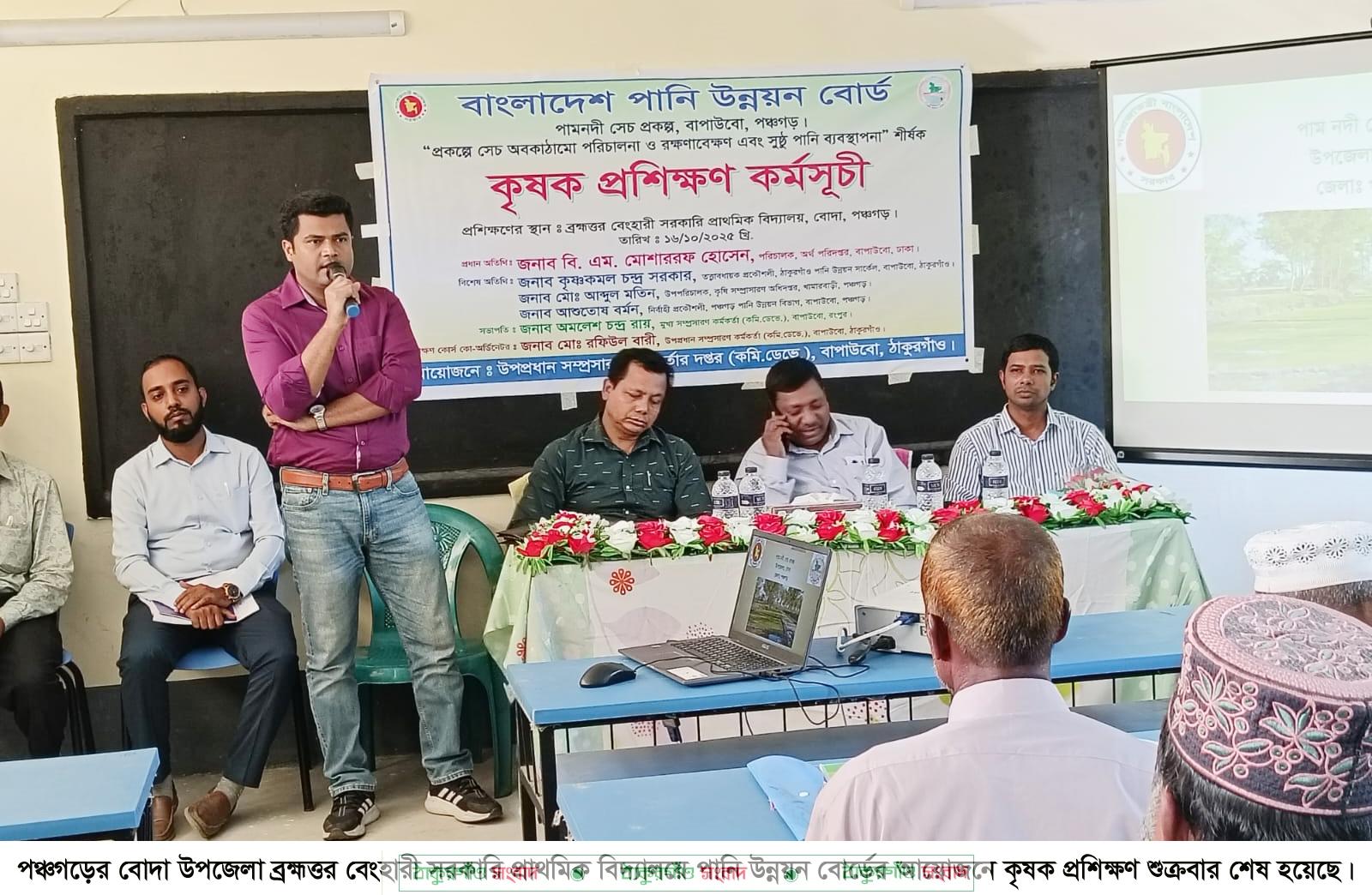 পঞ্চগড়ের বোদা উপজেলায় পানি উন্নয়ন বোর্ড পরিচালিত পামনদী সেচ প্রকল্পের সেচ অবকাঠামো পরিচালনা ও রক্ষণাবেক্ষণ এবং সুষ্ঠু পানি ব্যবস্থাপনা শীর্ষক দুই দিনের কৃষক প্রশিক্ষণ কর্মসূচি গতকাল শুক্রবার বিকেলে শেষ হয়েছে। বাপাউবো ঠাকুরগাঁওয়ের উপ প্রধান সম্প্রসারণ কর্মকর্তার কার্যালয় ওই প্রশিক্ষণ কর্মসূচির আয়োজন করে। প্রশিক্ষণে প্রকল্পের পানি ব্যবস্থাপনা দলের ৩০ জন সদস্য অংশগ্রহণ করে। এর আগে গত বৃহস্পতিবার দুপুরে বেংহারী বনগ্রাম ইউনিয়নের ব্রহ্মতর বেংহারী সরকারি প্রাথমিক বিদ্যালয়ে প্রশিক্ষণ কর্মসূচির উদ্বোধন করেন পানি উন্নয়ন বোর্ড প্রধান কার্যালয়ের অর্থ পরিদপ্তরের পরিচালক বি. এম. মোশাররফ হোসেন। বাপাউবো রংপুরের মূখ্য সম্প্রসারণ কর্মকর্তা (কমিউনিটি ডেভেলপমেন্ট) অমলেশ চন্দ্র রায়ের সভাপতিত্বে উদ্বোধনী অনুষ্ঠানে বিশেষ অতিথি হিসেবে উপস্থিত ছিলেন বাপাউবো ঠাকুরগাঁওয়ের তত্ত¡াবধায়ক প্রকৌশলী কৃষ্ণকমল চন্দ্র সরকার, বাপাউবো পঞ্চগড় এর নির্বাহী প্রকৌশলী আশুতোষ বর্মন ও পঞ্চগড় কৃষি সম্প্রসারণের অতিরিক্ত উপ পরিচালক বাসুদেব রায়। প্রশিক্ষণে কোর্স কো-অর্ডিনেটর হিসেবে রয়েছেন বাপাউবো ঠাকুরগাঁয়ের উপ প্রধান সম্প্রসারণ কর্মকর্তা (কমিউনিটি ডেভেলপমেন্ট) রফিউল বারী।