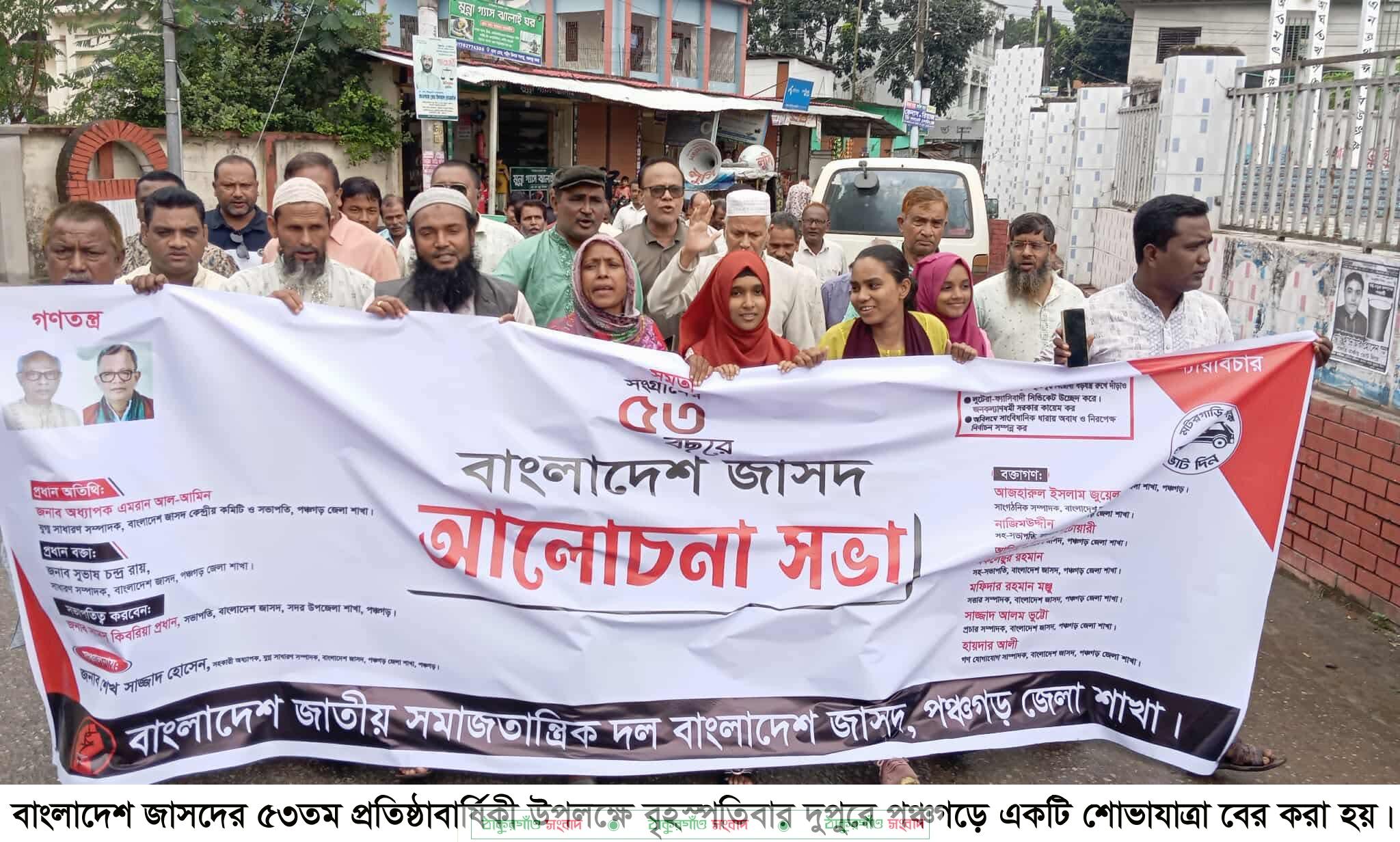 বাংলাদেশ জাসদের ৫৩তম প্রতিষ্ঠাবার্ষিকী পালন করা হয়েছে। এ উপলক্ষে বাংলাদেশ জাসদ পঞ্চগড় জেলা শাখা আয়োজনে বর্ণাঢ্য শোভাযাত্রা ও আলোচনা অনুষ্ঠিত হয়। গতকাল বৃহস্পতিবার দুপুরে পঞ্চগড় কেন্দ্রীয় শহীদ মিনার চত্বর থেকে শোভাযাত্রাটি বের হয়ে শহরের প্রধান প্রধান সড়ক ঘুরে আবার সেখানে এসে শেষ হয়। সেখানে অনুষ্ঠিত হয় আলোচনা সভা। বাংলাদেশ জাসদের সদর উপজেলা শাখার সভাপতি শামুস কিবরিয়া প্রধানের সভাপতিত্বে অনুষ্ঠিত সভায় প্রধান অতিথি বক্তব্যে বাংলাদেশ জাসদের কেন্দ্রীয় কমিটির যুগ্ম সাধারণ সম্পাদক ও জেলা সভাপতি অধ্যাপক এমরান আল আমিন। সভায় প্রধান বক্তা ছিলেন জেলা শাখার সাধারণ সম্পাদক সুভাষ চন্দ্র রায়। অন্যান্যদের মাঝে বক্তব্য দেন সদর উপজেলা শাখার সাধারণ সম্পাদক আজহারুল ইসলাম জুয়েল ও জেলা শাখার যুগ্ম সাধারণ সম্পাদক শেখ সাজ্জাদ হোসেন বক্তব্য দেন। এ সময় সাবেক সভাপতি ও বীর মুক্তিযোদ্ধা আব্দুল মজিদ বাবুল, সহ-সভাপতি মো. নাজিম উদ্দিন, আতিকুল পাটোয়ারী বিকম, আনছার আলী মিঠুন, নীতিশ কুমার রায়, সাজ্জাদ হোসেন ভুট্টো, হায়দারসহ জেলা উপজেলা শাখার নেতাকর্মী ও সমর্থকরা উপস্থিত ছিলেন।