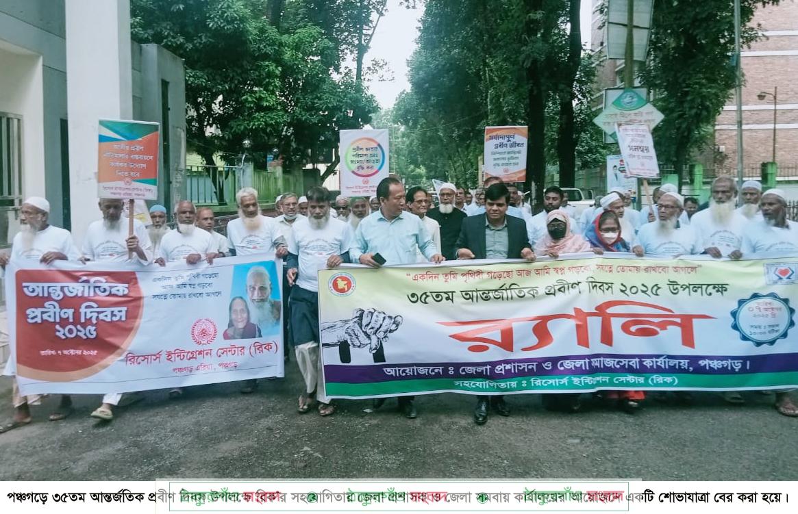 পঞ্চগড় প্রতিনিধি\‘একদিন তুমি পৃথিবী গড়েছো আজ আমি স্বপ্ন গড়বো, সযতেœ তোমায় রাখবো আগলে’ প্রতিপাদ্যে পঞ্চগড়ে ৩৫তম আন্তর্জাতিক প্রবীণ দিবস পালন করা হয়েছে। এ উপলক্ষে রিসোর্স ইন্টিগ্রেশন সেন্টার-রিক’র সহযোগিতায় জেলা প্রশাসন ও জেলা সমাজসেবা কার্যালয়ের আয়োজনে বর্ণাঢ্য শোভাযাাত্রা ও আলোচনা সভা অনুষ্ঠিত হয়। গতকাল মঙ্গলবার সকালে জেলা কালেক্টরেট চত্বর থেকে একটি বর্ণাঢ্য শোভাযাত্রা বের হয়ে শহরের গুরুত্বপূর্ণ সড়ক প্রদক্ষিণ করে। শোভাযাত্রা শেষে জেলা প্রশাসকের সম্মেলন কক্ষে আলোচনা সভা অনুষ্ঠিত হয়। এতে প্রধান অতিথি হিসেবে উপস্থিত ছিলেন অতিরিক্ত জেলা প্রশাসক (সার্বিক) জনাব সুমন চন্দ্র রায়। আলোচনা সভায় বিশেষ অতিথি হিসেবে উপস্থিত ছিলেন জেলা সমাজ সেবা উপ-পরিচালক অনিরুদ্ধ কুমার রায় ও জেলা শিশু বিষয়ক কর্মকর্তা জনাব ডা. মো. মাহবুব সুমন। সভায় অন্যান্যদের মাঝে বক্তব্য দেন রিসোর্স ইন্টিগ্রেশন সেন্টার-রিক’র এরিয়া ম্যানেজার জনাব মো. রেজাউল করিম, প্রবীণ কমিটির মাগুড়া ইউনিয়ন সভাপতি মো. মোস্তাফিজুর রহমান, হাফিজাবাদ ইউনিয়নের প্রবীণ সভাপতি বীর মুক্তিযোদ্ধা জনাব মো. আফজাল হোসেন, অমরখানা ইউনিয়নের প্রবীণ কমিটির সভাপতি মো. মেহেদুল ইসলাম প্রমূখ। অনুষ্ঠান শেষে প্রধান অতিথি প্রবীণদের শারিরীক অবস্থার খোঁজ খবর নেন।