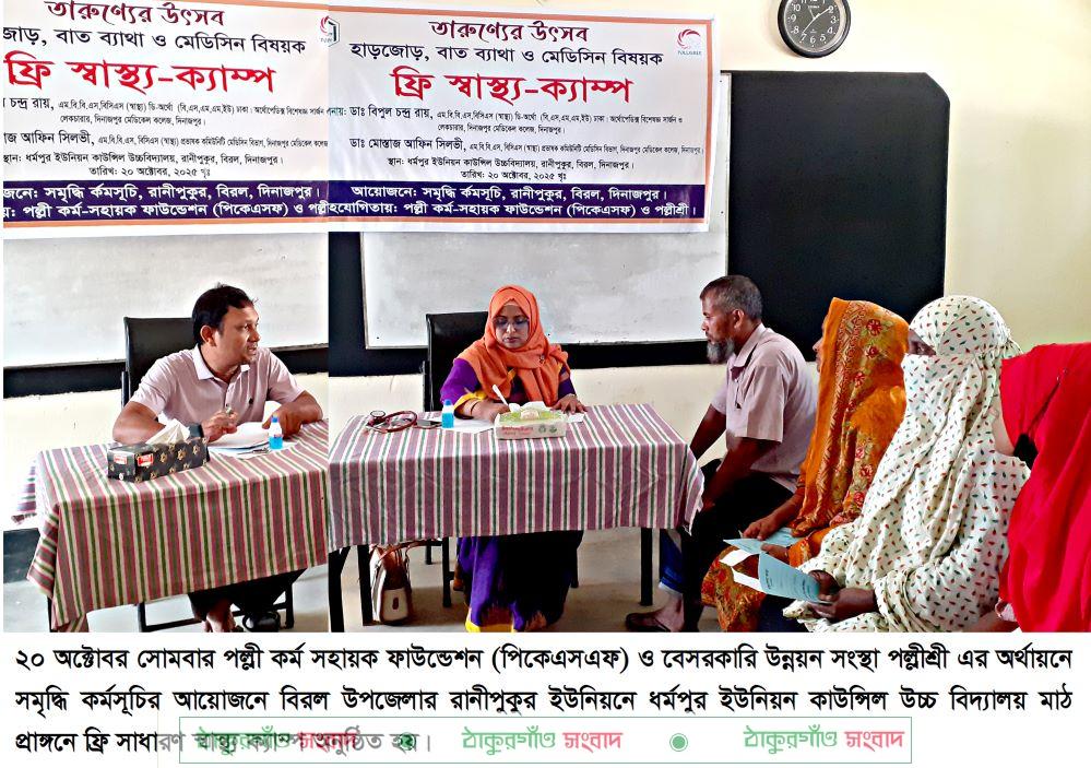 সোমবার পল্লী কর্ম সহায়ক ফাউন্ডেশন (পিকেএসএফ) ও বেসরকারি উন্নয়ন সংস্থা পল্লীশ্রী এর অর্থায়নে সমৃদ্ধি কর্মসূচির আয়োজনে বিরল উপজেলার রানীপুকুর ইউনিয়নে ধর্মপুর ইউনিয়ন কাউন্সিল উচ্চ বিদ্যালয় মাঠ প্রাঙ্গনে ফ্রি সাধারণ স্বাস্থ্য ক্যাম্প অনুষ্ঠিত হয়।