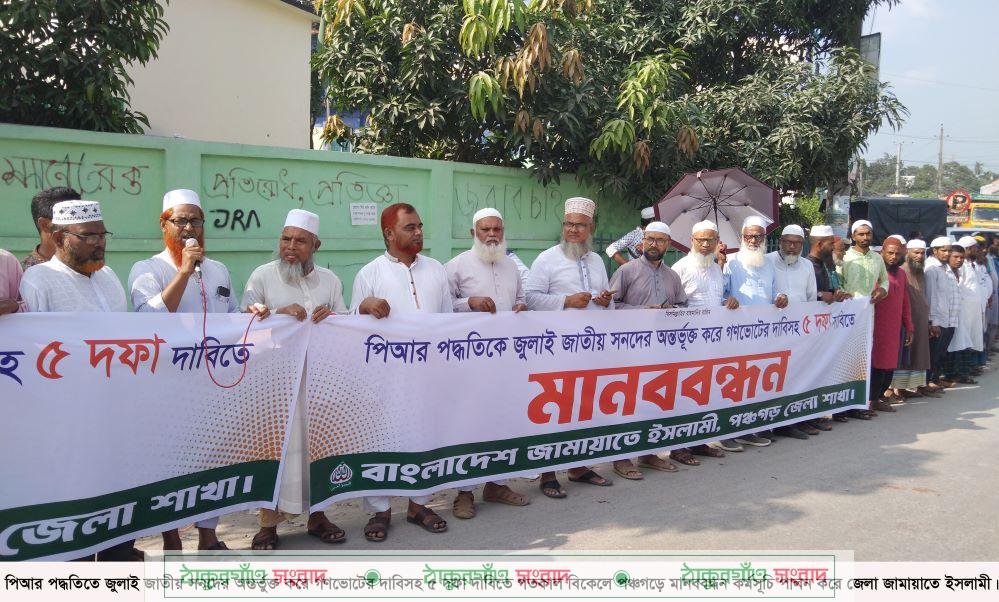 মানববন্ধনে জেলা জামায়াতের আমির মাওলানা ইকবাল হোসাইন বলেন, আগামী ফেব্রæয়ারিতে অনুষ্ঠিতব্য ত্রয়োদশ জাতীয় সংসদ নির্বাচনের পূর্বে জুলাই জাতীয় সনদ বাস্তবায়নের আদেশ জারী ও আদেশের ওপর গণভোটের আয়োজন করা, আগামী জাতীয় সংসদ নির্বাচনে পিআর পদ্ধতি চালু করাসহ পাঁচ দফা দাবি আদায়ে এর আগে আমরা প্রধান উপদেষ্টা বরাবরে স্মারকলিপি প্রদান করেছিলাম। আজ কেন্দ্রীয় কর্মসূচির অংশ হিসেবে মানববন্ধন কর্মসূচি পালন করা হলো। আমাদের দাবি মানা না হলে আরও বৃহত্তর আন্দোলনের কর্মসূচি দেয়া হবে।