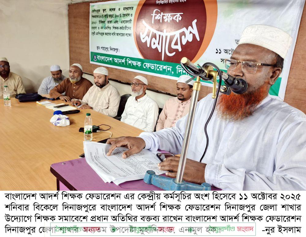 বাংলাদেশ আদর্শ শিক্ষক ফেডারেশন এর কেন্দ্রীয় কর্মসূচির অংশ হিসেবে ১১ অক্টোবর ২০২৫ শনিবার বিকেলে দিনাজপুরে বাংলাদেশ আদর্শ শিক্ষক ফেডারেশন দিনাজপুর জেলা শাখার উদ্যোগে, এমপিওভুক্ত স্কুল, কলেজ ও মাদরাসার শিক্ষকদের ৫০% বাড়ি ভাড়া, ১০০% বোনাস ও ১৫০০ টাকা চিকিৎসা ভাতা এবং এবতেদায়ী মাদরাসা ও নন এমপিওভুক্ত শিক্ষক-কর্মচারীদের চাকুরী এমপিওভুক্ত করণের দাবি আদায়ের লক্ষ্যে শিক্ষক সমাবেশ অনুষ্ঠিত হয়েছে।