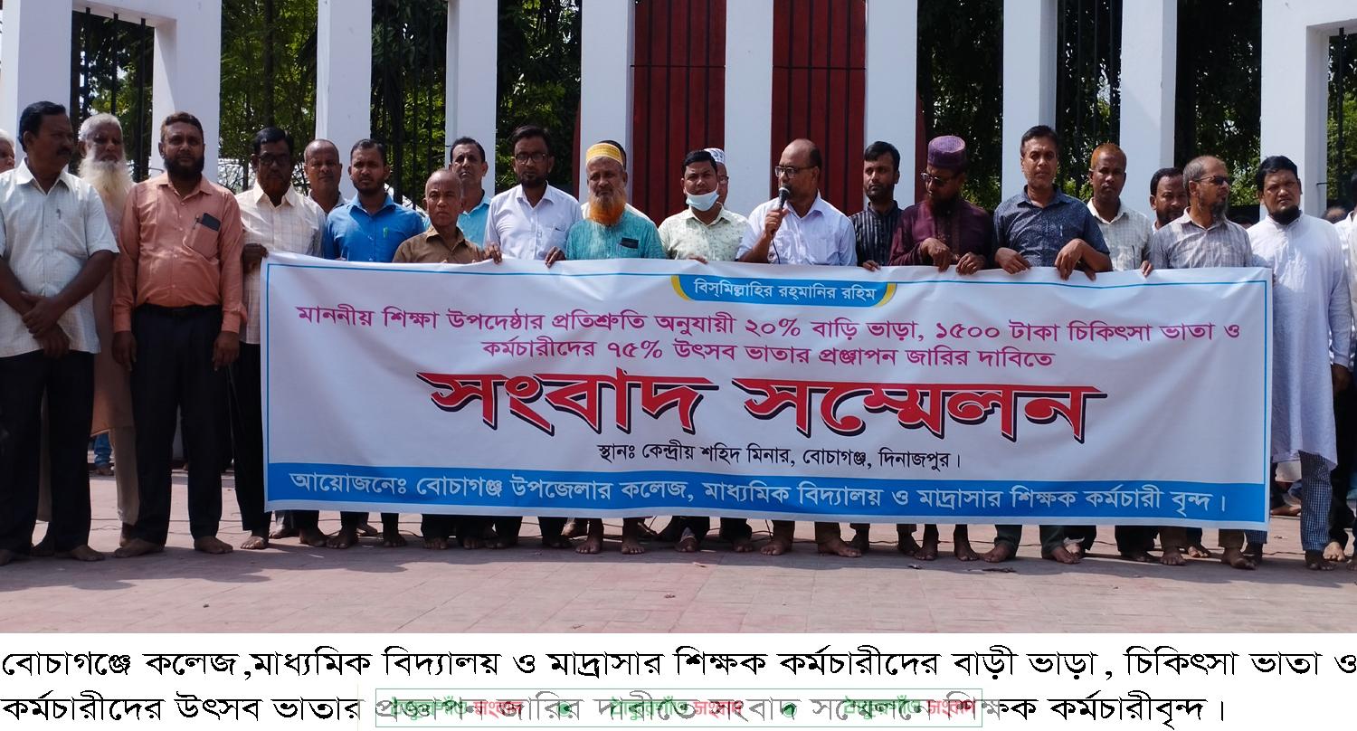 বোচাগঞ্জ (দিনাজপুর) প্রতিনিধি।। দিনাজপুরের বোচাগঞ্জ উপজেলার কলেজ,মাধ্যমিক বিদ্যালয় ও মাদ্রাসার শিক্ষক কর্মচারীদের বাড়ী ভাড়া, চিকিৎসা ভাতা ও কর্মচারীদের উৎসব ভাতার প্রজ্ঞাপন জারির দাবীতে সংবাদ সম্মেলন করেছে।