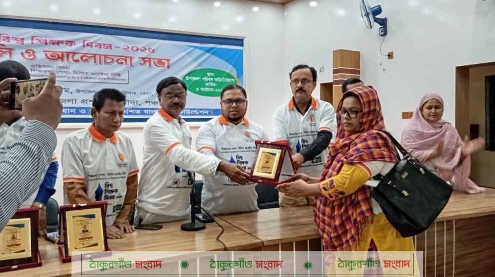 বোদা(পঞ্চগড়)প্রতিনিধি\বোদা উপজেলা প্রশাসনের আয়োজন এবং গণসাক্ষরতা অভিযান ও বিকশিত বাংলাদেশ ফাউন্ডেশন এর সহযোগিতায় রবিববার বোদায় র্যালি ও আলোচনা সভার মধ্য দিয়ে বিশ্ব শিক্ষক দিবস উদযাপিত হয়েছে। দিবসটি উপজেলার উপজেলা পরিষদ চত্বর থেকে একটি র্যালি বের করা হয়। র্যালিটি উপজেলা সদরের প্রধান প্রধান সড়ক প্রদক্ষিণ করে একই এলাকায় এসে শেষ হয়। পরে উপজেলা পরিষদ অডিটোরিয়ামে এক আলোচনা সভা অনুষ্ঠিত হয়। উপজেলা নির্বাহী অফিসার মো.রবিউল ইসলামের সভাপতিত্বে অনুষ্ঠিত আলোচনা সভায় বক্তব্য রাখেন উপজেলা মাধ্যমিক শিক্ষা অফিসার মোঃ আইবুল ইসলাম, উপজেলা শিক্ষা অফিসার মো: নজরুল ইসলাম,উপজেলা বিএনপির সভাপতি অধ্যাপক আব্দুল মান্নান, সাধারণ সম্পাদক আসাদুল্লাহ আসাদ, এনসিপির বোদা উপজেলা শাখার প্রধান সমন্বয়কারী শিশির আসাদ, বিকশিত বাংলাদেশ ফাউন্ডেশনের মোছা: মালেকা বেগম,আলোয়াখোয়া স্কুল এন্ড কলেজের সহকারী অধ্যাপক সাংবাদিক মাজেদুল ইসলাম আকাশ, শিক্ষক শেফালী বেগম, বোদা উপজেলা শিক্ষক কর্মচারী ঐক্যজোট এর সভাপতি সহকারী অধ্যাপক সাইফুল ইসলাম সোহাগ. বোদা পাথরাজ সরকারি কলেজের অধ্যক্ষ (ভারপ্রাপ্ত) মো: আলতাফ হোসেন ও তিতোপাড়া সরকারি প্রার্থমিক বিদ্যালয়ের প্রধান শিক্ষক মোঃ ইকবাল হোসেন।সভায় বোদা পাথরাজ সরকারি কলেজের অধ্যক্ষ (ভারপ্রাপ্ত) মোঃ আলতাফ হোসেন, বোদা পাইলট গার্লস স্কুল এন্ড কলেজের সহকারী প্রধান শিক্ষক নারগিস পারভীন, মানিকপীর বেংহারি ফাজিল ডিগ্রি মাদ্রাসার উপাধ্যক্ষ মোঃ মোজাহীদুল ইসলাম, বড়ুয়াপাড়া (নূতনহাট) সরকারি প্রাথমিক বিদ্যালযয়ের সহকারী শিক্ষক মোহাম্মদ মিজানুর রহমান ও আটিয়াগ্রাম সরকারি প্রাথমিক বিদ্যালযয়ের প্রধান শিক্ষক মোছাঃ নাজমুন নাহার উপজেলার ৫ জন গুনী শিক্ষককে সম্মাননা স্মারক প্রদান করা হয়।অতিথিরা তাদের হাতে ক্রেস তুলে দেন।