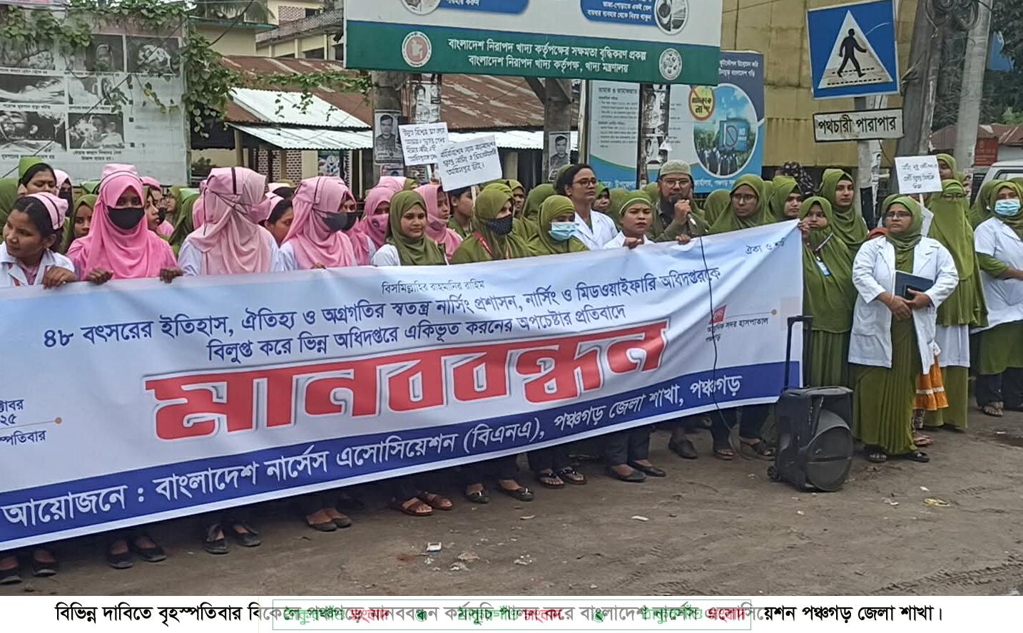 স্বতন্ত্র নার্সিং প্রশাসন, নার্সিং ও মিডওয়াইফারি অধিদপ্তর বিলুপ্ত করে ভিন্ন অধিদপ্তরে একিভূত করার অপচেষ্টার প্রতিবাদে পঞ্চগড়ে মানববন্ধন কর্মসূচি পালন করেছে বাংলাদেশ নার্সেস এসোসিয়েশন পঞ্চগড় জেলা শাখা। নার্সরা। গতকাল বৃহস্পতিবার বিকেলে সিভিল সার্জনের কার্যালয়ের সামনে মহাসড়কের পাশে অনুষ্ঠিত ওই মানববন্ধন কর্মসূচিতে বক্তব্য রাখেন পঞ্চগড় নার্সিং সুপারভাইজার আমিনা খাতুন, বাংলাদেশ নার্সেস এসোসিয়েশন পঞ্চগড়ের ছাত্র-ছাত্রী বিষয়ক সম্পাদক রাশিদা খাতুন, শিক্ষানবিশ নার্স মনিরা আক্তার প্রমূখ। এ সময় বক্তারা জানান, ৪৮ বছর ধরে নার্সিং ও মিডওয়াইফারি অধিদপ্তর চিকিৎসা সেবায় অবদান রেখে চলেছে। কিন্তু এখন এই অধিদপ্তরকে ভিন্ন অধিদপ্তরের সাথে একিভ‚ত করার অপচেষ্টা চলছে। পৃথক অধিদপ্তর না থাকলে চরম বিশৃঙ্খলা ও স্বাস্থসেবা ব্যাহত হবে। তাই তারা এই অধিদপ্তরকে অন্য কোন অধিদপ্তরের সাথে একিভ‚ত না করার দাবি জানান।