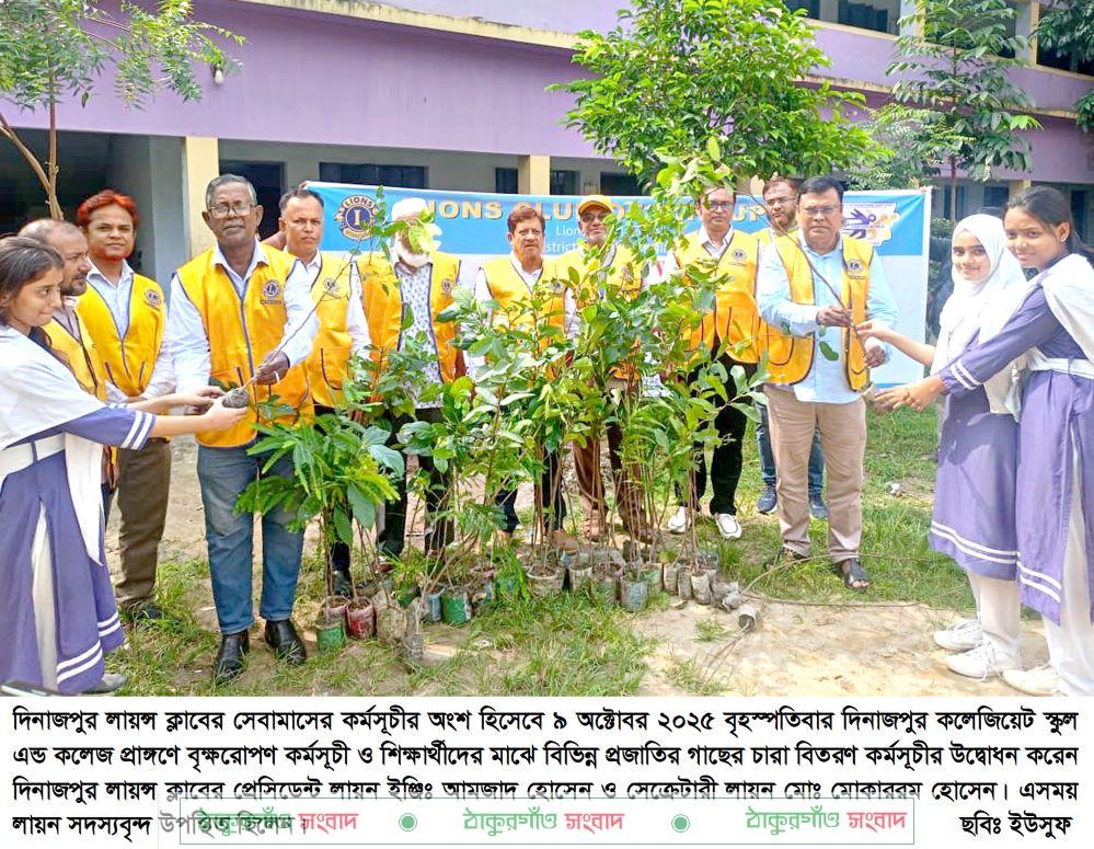 দিনাজপুর লায়ন্স ক্লাবের সেবামাসের কর্মসূচীর অংশ হিসেবে ৯ অক্টোবর ২০২৫ বৃহস্পতিবার সকাল ১০টায় দিনাজপুর কলেজিয়েট স্কুল এন্ড কলেজ প্রাঙ্গণে বৃক্ষরোপণ কর্মসূচী ও শিক্ষার্থীদের মাঝে বিভিন্ন প্রজাতির গাছের চারা বিতরণ করা হয়েছে। উক্ত কর্মসূচীর উদ্বোধণ করেন দিনাজপুর লায়ন্স ক্লাবের প্রেসিডেন্ট লায়ন ইঞ্জিঃ আমজাদ হোসেন ও সেক্রেটারী লায়ন মোঃ মোকাররম হোসেন(দিনাজপুর জেলা বিএনপির সিনিয়র সহ-সভাপতি ও দিনাজপুর সদর উপজেলা পরিষদের সাবেক ভাইস চেয়ারম্যান)।