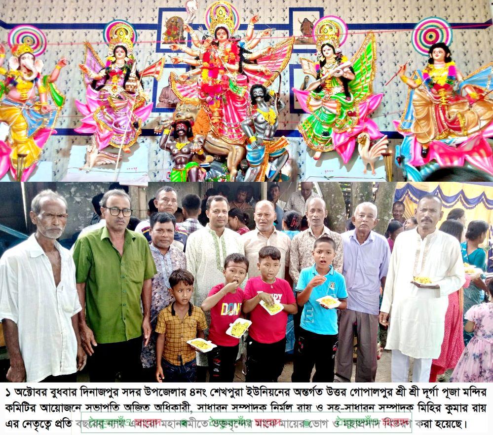 বুধবার দিনাজপুর সদর উপজেলার ৪নং শেখপুরা ইউনিয়নের অন্তর্গত উত্তর গোপালপুর শ্রী শ্রী দূর্গা পূজা মন্দির কমিটির আয়োজনে প্রতি বছরের ন্যায় এবারো মহানবমীতে ভক্তবৃন্দের মাঝে মায়ের ভোগ ও মহাপ্রসাদ বিতরণ করা হয়েছে।