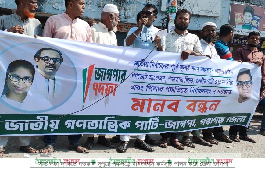 জাতীয় নির্বাচনের পূর্বে জুলাই সনদ বাস্তবায়ন আদেশ জারী ও গণভোটের আয়োজন এবং পিআর পদ্ধতিতে নির্বাচনসহ সাত দফা দাবিতে কেন্দ্র ঘোষিত কর্মসূচির অংশ হিসেবে পঞ্চগড়ে মানববন্ধন কর্মসূচি পালন করেছে জেলা জাগপা। গতকাল বুধবার দুপুরে জেলা শহরের চৌরঙ্গী মোড়ে পঞ্চগড়-ঢাকা মহাসড়কের ধারে ওই মানববন্ধন কর্মসূচি পালন করে তারা। এ সময় বক্তব্য দেনন জেলা জাগপা সভাপতি বীর মুক্তিযোদ্ধা আনসার আলী, সাধারণ সম্পাদক শাহরিয়ার আলম বিপ্লব, সাংগঠনিক সম্পাদক কামাল হোসেন পাটোয়ারী, সদর উপজেলা জাগপা সভাপতি আনোয়ারুল ইসলাম, আটোয়ারী উপজেলা জাগপা সাধারণ সম্পাদক বজলুর রহমান, বোদা উপজেলা জাগপা নেতা লুৎফর রহমান, জেলা যুব জাগপা সভাপতি কামরুজ্জামান কুয়েত, সাধারণ সম্পাদক মোকসেদুল আলম, জাগপা ছাত্রলীগের সভাপতি শাহাদাত হোসেন সেলিম প্রমুখ।